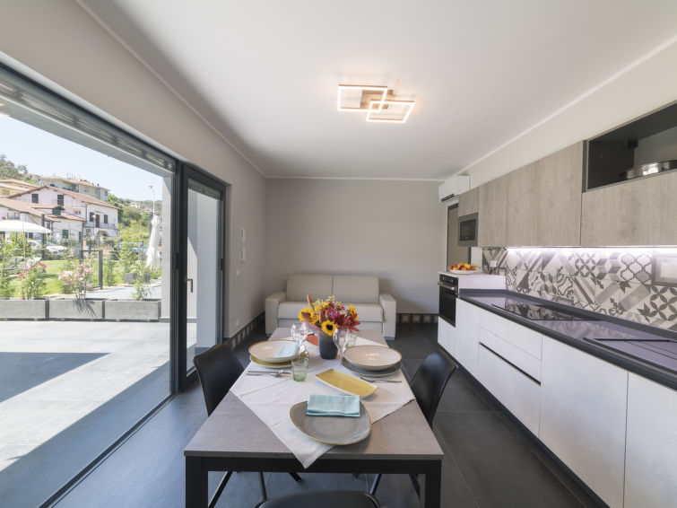Moderne, komfortabel residens "Al Bistrot dei Vinai", med 2 etasjer, bygget i 2022. 6 leiligheter i residensen. I området Caramagna 1.5 km fra sentrum av Imperia, 25 km fra sentrum av San Remo, 90 km fra sentrum av Nizza, i en solrikt posisjon i et boligområde, 1.5 km fra sjøen. Fellesbruk: stor, velholdt hage 1'000 m2 (inngjerdet) med plen og blomster, plen med solningsområde, 1 badebasseng (5 x 15 m, dybde 140 cm dyp, Sesongåpent: 01.Mai. - 31.Okt.). Utendørs dusj, hagemøbler, grill, lekeplass (rutsjebane), Underholdning av bassenget av eieren/gartneren. I huset: heis, sykkelrom, airconditioning, vaskemaskin, tørketrommel (for felles bruk), sykkelutleie. Oppbevaringsrom tilgjengelig. Tilgang med bil hele veien til hbrukt. Parkering (for 6 biler), felles garasje. Kjøpesenter 1 km, restaurant 2 km, bar 1 km, bakeri 600 m, café 2 km, sykkelutleie 2 km, bussholdeplass 100 m, togstasjon "Imperia" 6 km, småstenstrand "Borgo Prino" 2 km. Attraksjoner i nærheten: Dolcedo Mountainbiken am Monte Faudo 7 km, Küstenradweg von Imperia bis Ospedaletti 2 km, Valloria das Dorf mit 150 bemalten Türen 10 km. Vennligst merk: bil anbefales. Det er flere lignende leiligheter i samme hus.
