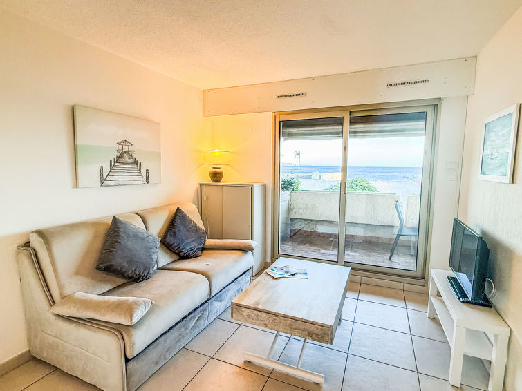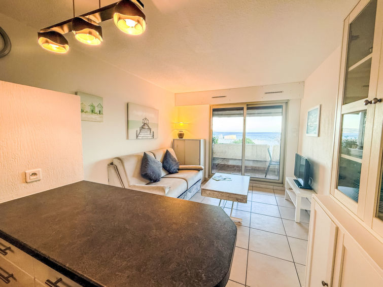 3 rom leilighet 35 m2 i 1st etasje, beliggenhet mot sør. Praktiskt og komfortabelt møbler: stue/spisestue med panoramavindu med, 1 dobbel sovesoffa (1 x 140 cm, lengde 190 cm), TV (flatskjerms TV), air-conditioning og motoriserte persienner. Utgang til terrassen. 1 rom med panoramavindu med, 1 dobbeltseng (1 x 140 cm, lengde 190 cm), el-radiator. Utgang til terrassen. 1 rom med, 1 x 2 køysenger (80 cm, lengde 190 cm), el-radiator. Åpent kjøkken (stekeovn, oppvaskmaskin, 3 keramiske kokeplater, brødrister, vannkoker, mikrobølgeovn, frys, elektrisk kaffemaskin, Internet(Nespresso), ekstra). Dusj, sep. WC. El-oppvarming, vannkoker (100 liter). Terrasse 11 m2, beliggenhet mot sør. Terrassemøbler, liggestoler (2). Vakker utsikt av havet. Fasiliteter: vaskemaskin. Internett (trådløs LAN [WLAN], ekstra). Parkeringsplass plass nr 15 (inngjerdet). Vennligst merk: bare TV FR. Røykvarsler.
