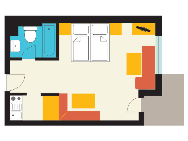 31 m2. mere informasjon fra eieren: 31 m2 , living-/bed room with double bed, sofa with little table, bench seat with dining table , kitchenette with 2 plate stove, fridge etc. bathroom, satellite TV/radio, telephone, internet. Possibility to contact us for any questions you have since we live in the same building.