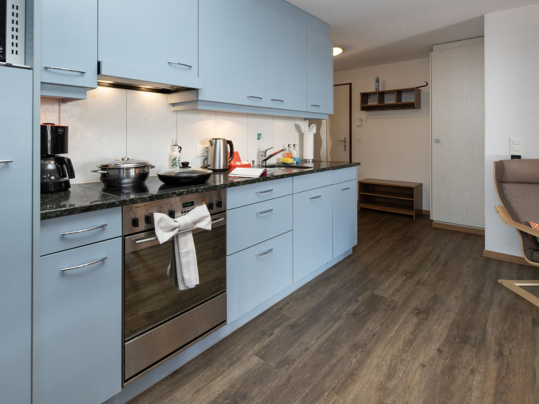 2 rom leilighet 42 m2, på bakkeplan, beliggenhet mot sør-vest. Moderne og koseligt møbler: stue/soverom med, 1 dobbel sovesoffa (140 cm, lengde 200 cm), internasjonale TVkanaler, radio og CD-spiller. Utgang til sitteplass i hagen, beliggenhet mot sør og beliggenhet mot vest. 1 rom med, 1 dobbeltseng (140 cm, lengde 200 cm). Åpent kjøkken (stekeovn, oppvaskmaskin, 4 keramiske kokeplater, brødrister, vannkoker, mikrobølgeovn, elektrisk kaffemaskin, Internet(Nespresso), ekstra, raclettegrill (ost)). Dusj/WC. Varmekabler i gulvet. Parkett. Sitteplass i hagen, beliggenhet mot sør og beliggenhet mot vest. Balkongmøbler. Meget vakker utsikt av fjellene og landskapet. Fasiliteter: hårføner. Internett (trådløs LAN [WLAN], gratis). Parkeringsplass plass nr 22. Vennligst merk: røykfri bolig. Kjæledyr / hund tillatt 1 kjæledyr / hund tillatt. Brannslukkningsapparat.