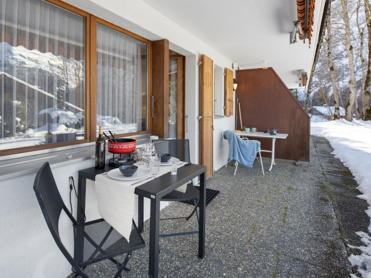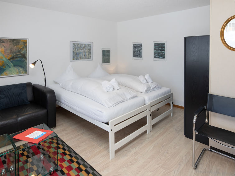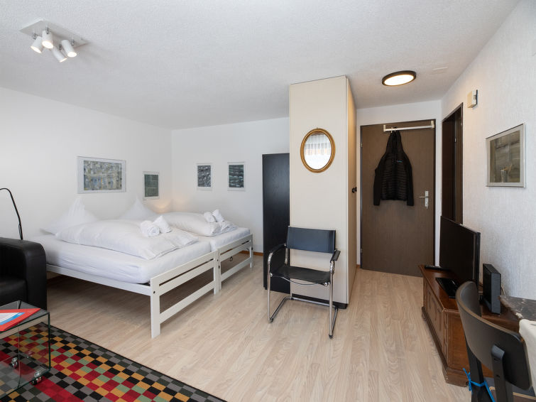 1 rom leilighet 25 m2, på bakkeplan, beliggenhet mot sør. Lys, koseligt møbler: stue/soverom med 2 senger (90 cm lengde 200 cm), kabel-TV (flatskjerms TV). Utgang til sitteplass i hagen, beliggenhet mot sør. Åpent kjøkken (stekeovn, 4 keramiske kokeplater, elektrisk kaffemaskin, Internet(Nespresso), ekstra, raclettegrill (ost)). Utgang til sitteplass i hagen. Dusj/WC. Parkett. Stor sitteplass i hagen, beliggenhet mot sør. Terrassemøbler, liggestoler (2). Hærlig utsikt av fjellene. Fasiliteter: hårføner. Internett (trådløs LAN [WLAN], gratis). Parkeringsplass ved hbrukt. Vennligst merk: røykfri bolig. Brannslukkningsapparat.