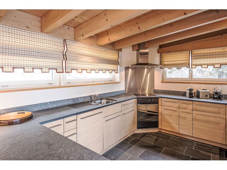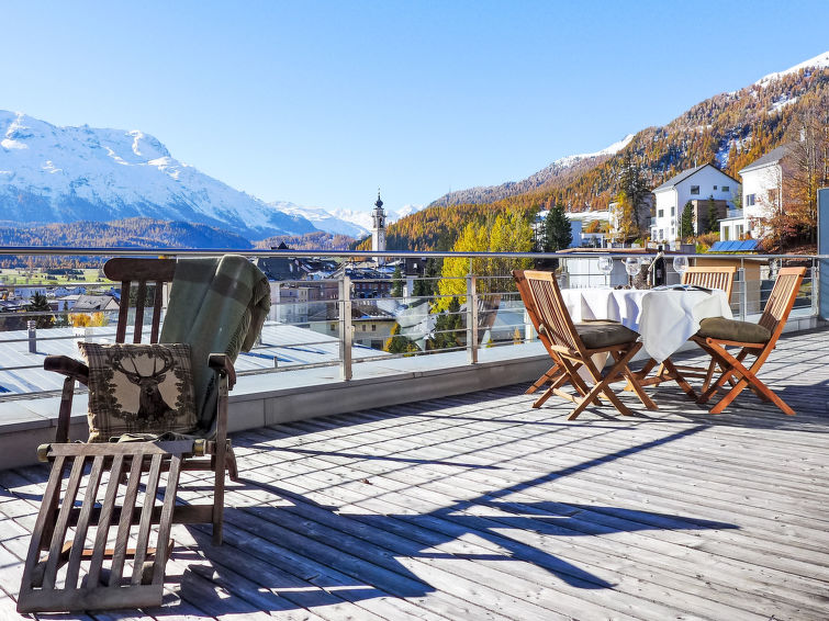 "Chesa Crusch 7", 3 rom taketasje 100 m2 på 2 etasjer. Romlig og lys, moderne og stilfullt møbler: stue/spisestue med, TV og radio. Stort, åpent kjøkken (stekeovn, oppvaskmaskin, 4 keramiske kokeplater, brødrister, frys, elektrisk kaffemaskin, Internet(Nespresso), ekstra). Sep. WC. Oppvarming. I underetasje: 1 rom med, 1 dobbeltseng (2 x 90 cm, lengde 190 cm). 1 rom med, 1 dobbeltseng (2 x 85 cm, lengde 190 cm). Bad/bidé/WC, dusj/bidé/WC. Tregulv. Stor terrasse 40 m2, beliggenhet mot sør. Terrassemøbler. Hærlig panoramautsikt av fjellene og området. Fasiliteter: hårføner. Internett (trådløs LAN [WLAN], gratis). Garasje plass nr 14 på tomten (1 Bil), høyde 235 cm, bredde 235 cm. Vennligst merk: ikke egnet for små barn. Røykfri bolig.