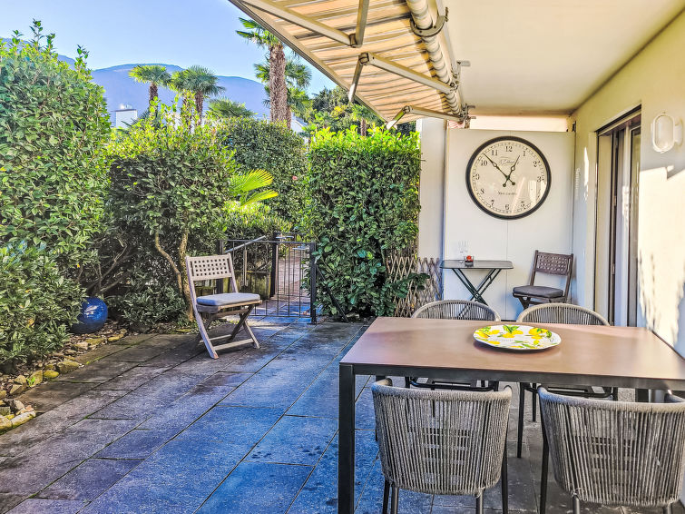 Ascona: Fin, komfortabel residens "Colina Verde", bygget i 1986, renovert i 2008, omgitt av trær. I utkanten, 1.7 km fra sentrum av Ascona, i en roligt, solrikt, høyt posisjon, utmerkt område: midt i sentrum, men roligt, 1.7 km fra innsjø, i en blindvei, i det grønne. Fellesbruk: park, hage, 1 badebasseng firkantet (11 x 5 m, Sesongåpent: 20.Apr. - 15.Okt.) med innbygdetrapper og overtrekk. Utendørs dusj, grill. Privat: sitteplass (20 m2). I huset: heis, sentralvarme, vaskemaskin, tørketrommel (for felles bruk ekstra). Felles garasje nr 108. Butikk 1 km, daglivarehandel 1 km, supermarked 1 km, restaurant 200 m, bakeri 500 m.minutters gange til sentrum 20, bussholdeplass 200 m, togstasjon "Locarno SBB- CFF-FFS" 3.3 km, utendørs svømmebasseng 3.5 km, innendørs pool 5 km. Sporthavn 3.5 km, golfbane(18 hull) 3.5 km, minigolf 1.5 km, skøytebane 200 m. Attraksjoner i nærheten: Falconeria, Locarno, Isole di Brissago, Mercato Cannobio, IT (Sonntag), Mercato Intra, IT (Samstag), Mercato Luino, IT (Mittwoch), Mercato di Ascona (velkjente innsjøer: Lago Maggiore, Lago di Lugano, Lago di Orta, Lago di Como. Turstier Monte Verita, Valle Maggia, Valle Verzasca, Gambarogno, Valle Onsernone, Centovalli etc. Vennligst merk: velegnet for barnefamilier, passer for eldre.