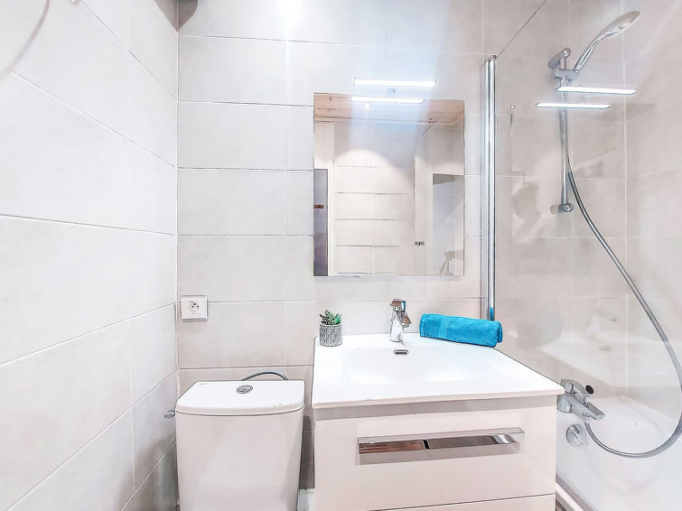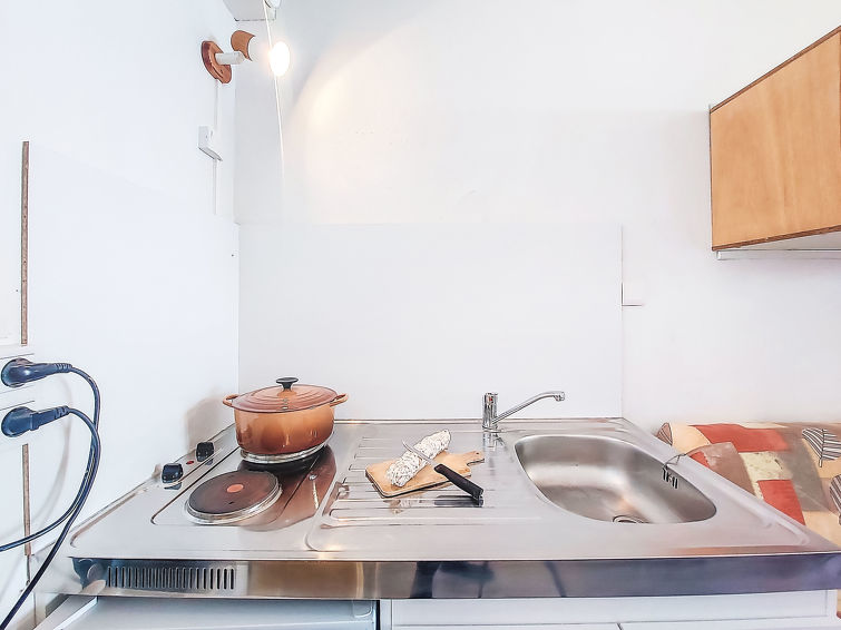 1 rom etromsleilighet 23 m2 i 4th etasje, beliggenhet mot sør. Enkelt møbler: stue/soverom med, 1 dobbel sovesoffa (130 cm, lengde 190 cm), 1 x 2 køysenger (80 cm, lengde 190 cm), TV (flatskjerms TV). Utgang til balkongen. Kjøkkenkrok (2 kokeplater, miniovn, vannkoker, mikrobølgeovn, elektrisk kaffemaskin, raclettegrill (ost)). Bad/WC. El-oppvarming. Parkett. Balkong 5 m2, beliggenhet mot sør. Balkongmøbler. Vakker utsikt av fjellene. Fasiliteter: strykejern, hårføner. Internett (trådløs LAN [WLAN], ekstra). Vennligst merk: røykfri bolig. Røykvarsler. Tilbud fra en privatperson i henhold til art. 155, IV av CGI.