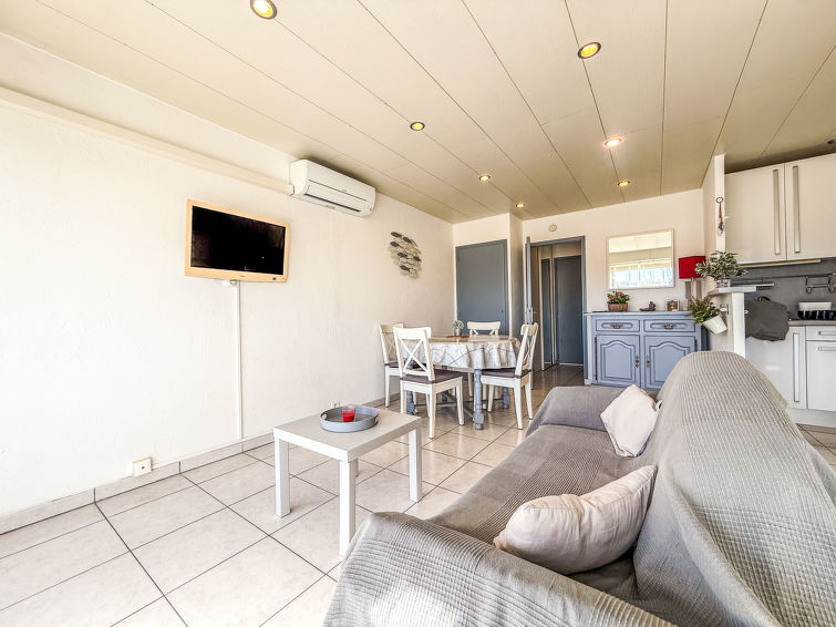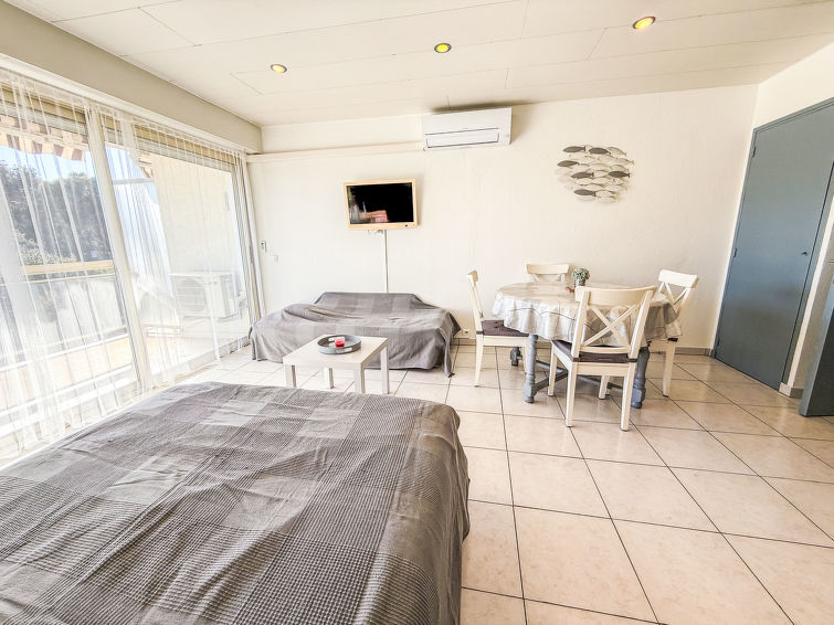 1 rom leilighet 40 m2 i 1st etasje, beliggenhet mot sør. Vakkert møbler: stue/spisestue med, 2 sovesoffaer (90 cm, lengde 190 cm), 1 dobbeltseng som felles ned fra veggen (140 cm, lengde 190 cm), TV (flatskjerms TV). Utgang til terrassen. Kjøkkenkrok (2 keramiske kokeplater, mikrobølgeovn, elektrisk kaffemaskin). Dusj/WC. El-oppvarming, airconditioning. Terrasse 12 m2. Terrassemøbler. Ved siden utsikt av havet. Fasiliteter: strykejern, hårføner. Internett (trådløs LAN [WLAN], ekstra). Parkeringsplass plass nr 223 (inngjerdet). Vennligst merk: max kjæledyr / hund tillatt 1 kjæledyr / hund tillatt. Bare TV FR. Røykvarsler.