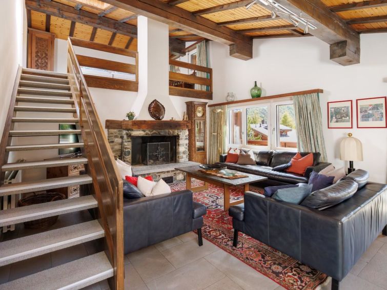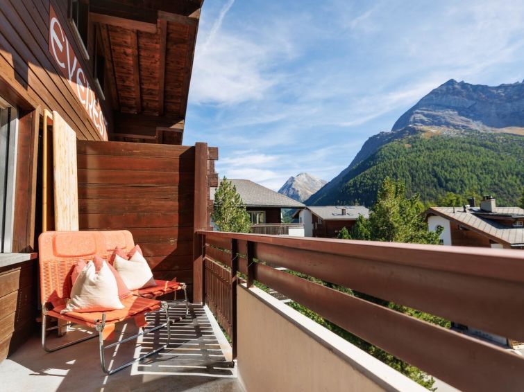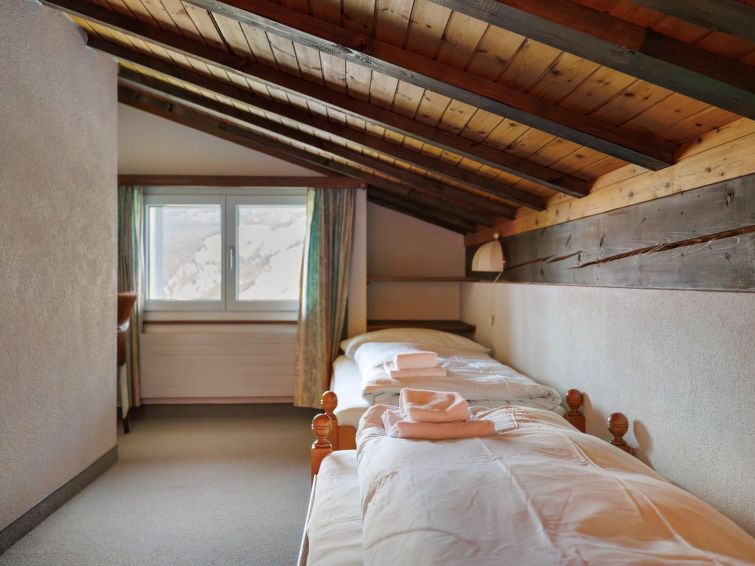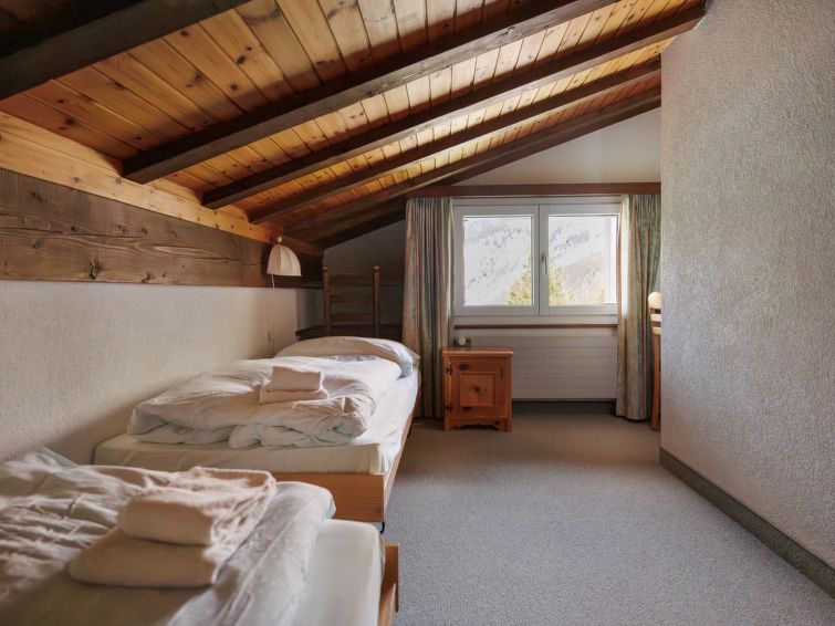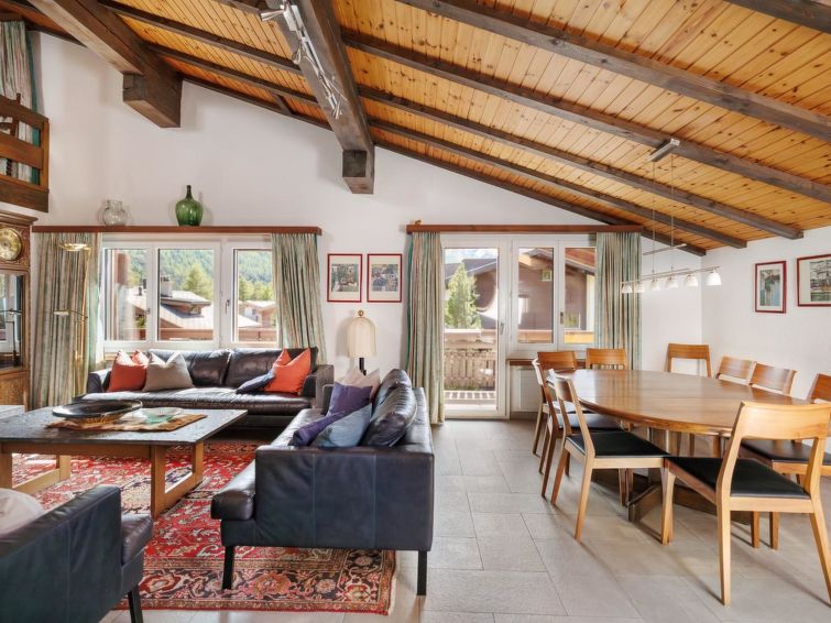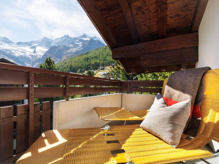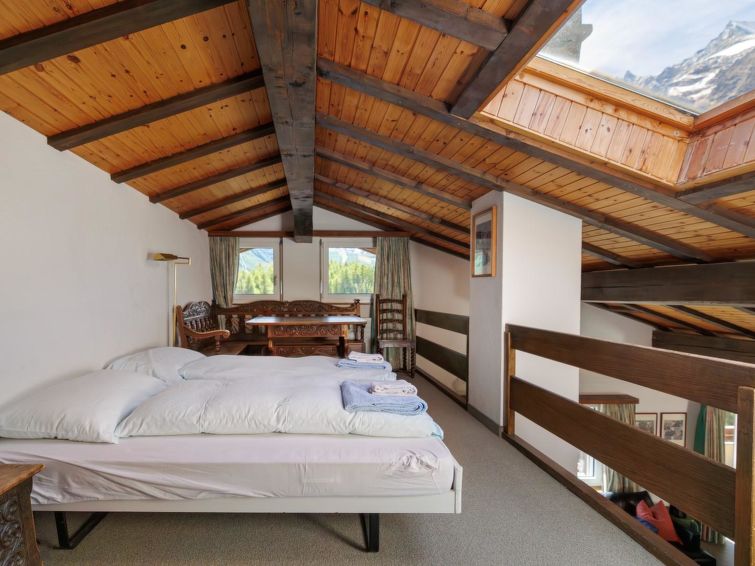 Penthouse Everest P is a cosy and spacious apartment spread over 2 floors. It is located in a sunny and quiet hamlet of Saas-Fee. The apartment features 4 bedrooms and 2 single beds on the gallery above the living room. Two bedrooms are located on the lower floor and 2 smaller bedrooms are on the top floor with sloping roof. On each floor you will find a bathroom: Shower/bath/WC/ double sink & sauna on the lower floor, shower/WC on the top floor. The dining and living area is joined and features an open fireplace as well as HD-Smart TV (no wood service). On the balcony you can soak up the sun and enjoy amazing views over the mountains. The separate kitchen is fully equipped with microwave, oven, stove, fridge, small freezer, dishwasher, kettle, toaster, mixer, fondue set and raclette oven. Shared wifi is available.