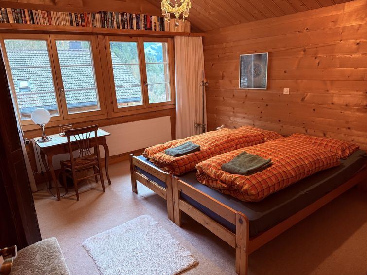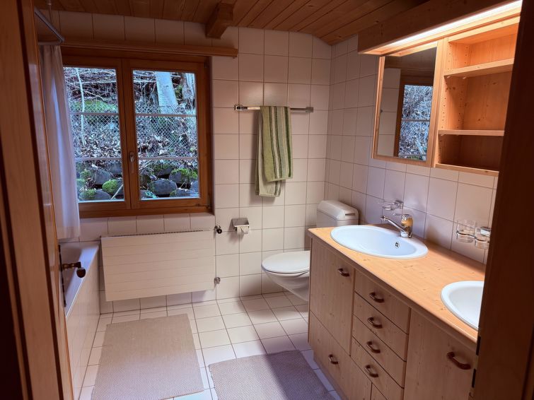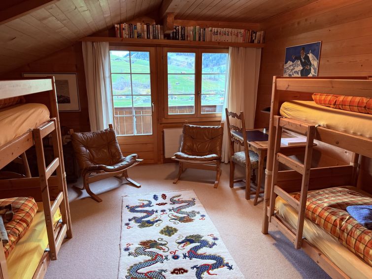 3-room apartment on 2 levels, south-west facing position, comfortable furnishings, 2 balconies with terrace furniture, beautiful view of the mountains and the resort. 2nd floor: large living/dining room with Scandinavian wood stove and satellite TV (flat screen), video, radio, CD-player and DVD. Exit to the balcony. Kitchen with dining table (among other things furnished with coffee machine with capsules (Delizio) as well as a fondue- and raclette-set). Shower/WC. 3rd floor: 1 bedroom with 2 beds (2x90x200cm). 1 bedroom with 2 bunk beds (each 90x200cm). Exit to the balcony. Bath/WC. WiFi. Baby cot (60x120cm) incl. bed linen available.