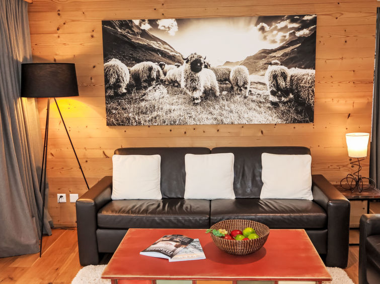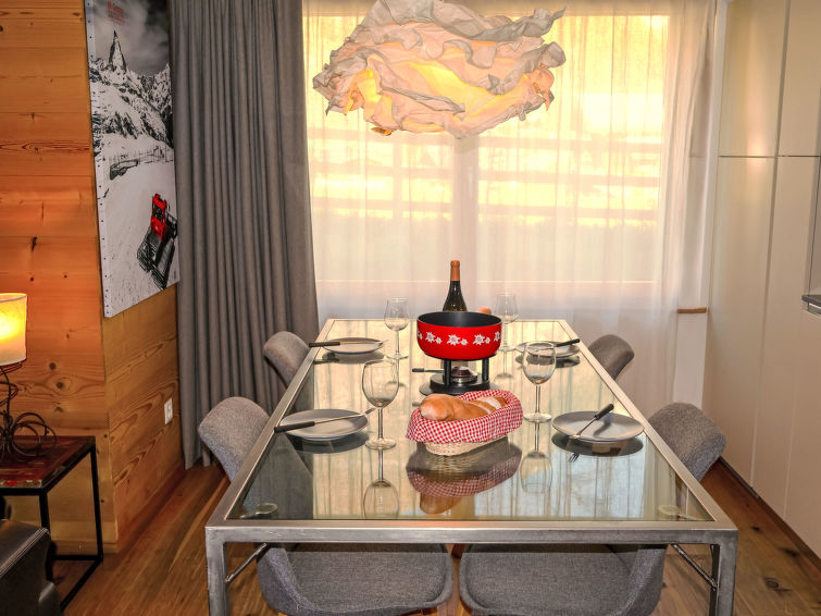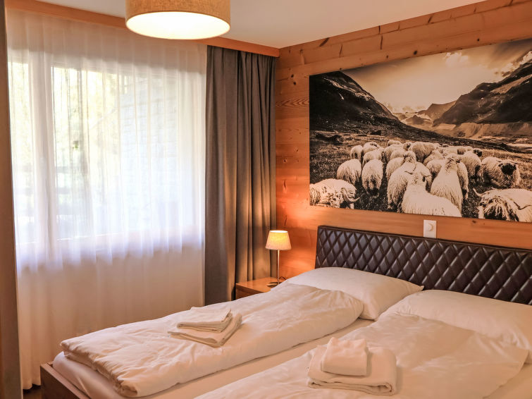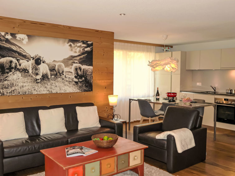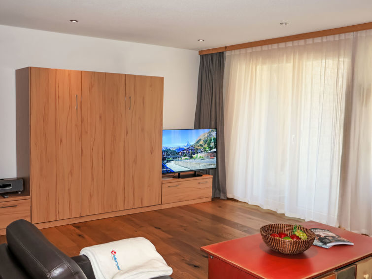 2 rom leilighet 70 m2, nederste etasje, beliggenhet mot sør-vest. Romlig og lys, vakkert og moderne møbler: stue/soverom med, 1 dobbel skapseng (2 x 90 cm, lengde 200 cm), flatskjerms TV, radio og DVD. Utgang til terrassen, beliggenhet mot sør. 1 rom med, 1 dobbeltseng (2 x 90 cm, lengde 200 cm). Åpent kjøkken (stekeovn, oppvaskmaskin, 4 keramiske kokeplater, brødrister, vannkoker, frys, elektrisk kaffemaskin (ost)) med spisebord. Dusj/WC, massasjedusj. Varmekabler i gulvet. Parkett. Terrasse, beliggenhet mot sør. Terrassemøbler, grill. Vakker utsikt av Matterhorn. Fasiliteter: hårføner. Internett (trådløs LAN [WLAN]). Vennligst merk: røykfri bolig.