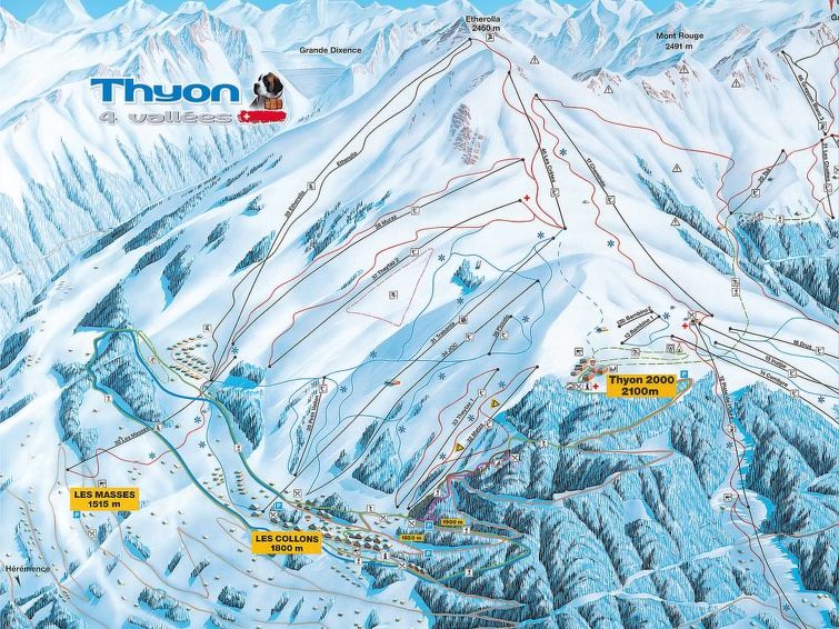 Residens "Le Hameau", 1'850 m.o.h. Ovenfor Les Collons, i en roligt posisjon, beliggenhet mot øst. Fellesbruk: 1 badebasseng oppvarmt (10 x 5 m, dybde 125- 160 cm dyp, 01.07.-15.09. og 20.12.-18.04. bassengets åpningstider: 09:00-21:00). Dusj/WC ved bassenget. I hbrukt: badstu, avslappningsrom, heis, skirom, vaskemaskin, tørketrommel (for felles bruk). Overdekket, parkering (begrenset antall plasser). Supermarked 900 m, restaurant 50 m. Gondolheis, skibakker 150 m. Attraksjoner i nærheten: Sion 18 km. Vennligst merk: nøkkelleveringen skjer i Imalp Thyon SA i Les Collons. Bildet er et eksempel. Det er flere lignende leiligheter i samme hus. Alle hus/leiligheter er individuellt inredde.