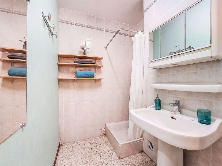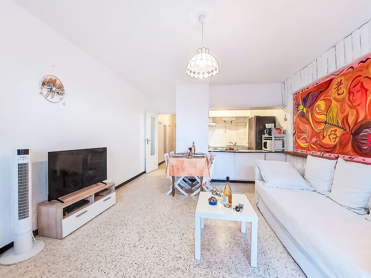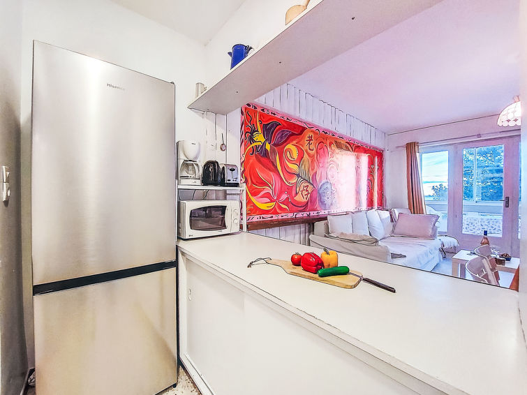 2 rom leilighet 48 m2 i 4th etasje. Stue/spisestue med, 1 dobbel sovesoffa (145 cm, lengde 200 cm), TV. 1 rom med, 1 dobbeltseng (140 cm, lengde 180 cm). Kjøkkenkrok (stekeovn, oppvaskmaskin, 4 keramiske kokeplater, mikrobølgeovn). Dusj/WC. Terrasse 10 m2, dekt, beliggenhet mot sør. Terrassemøbler. Delvis utsikt av havet. Fasiliteter: Internett (trådløs LAN [WLAN], ekstra). Vennligst merk: ingen parkeringsplass. Kjæledyr / hund tillatt 1 kjæledyr / hund tillatt. Røykvarsler.