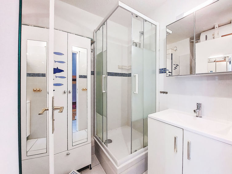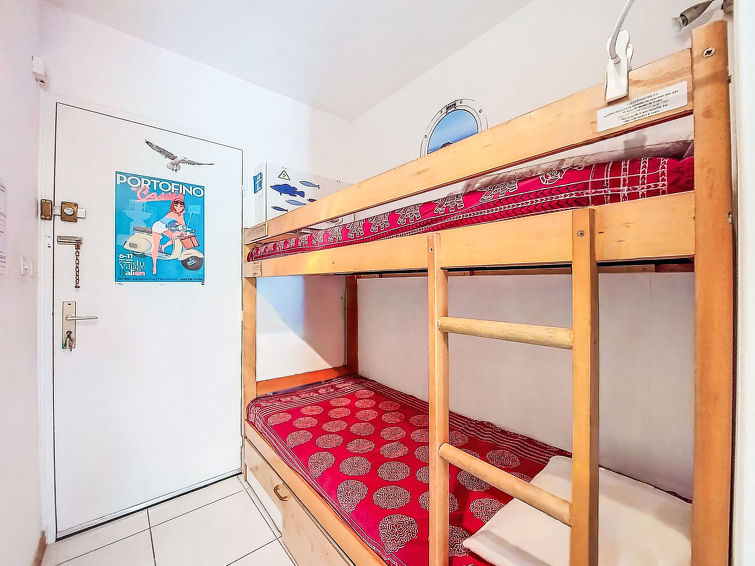1 rom leilighet 23 m2 i 1st etasje, beliggenhet mot sør. Lys, praktiskt møbler: inngang, uten vindu med, 1 x 2 køysenger (80 cm, lengde 190 cm). Stue/spisestue med, 1 dobbel sovesoffa (140 cm, lengde 200 cm), TV og DVD. Utgang til terrassen. Kjøkkenkrok (2 kokeplater, miniovn, brødrister, vannkoker, mikrobølgeovn, elektrisk kaffemaskin). Dusj/WC. El-oppvarming. Terrasse 6 m2, dekt, beliggenhet mot sør. Terrassemøbler. Fasiliteter: vaskemaskin, strykejern. Internett (trådløs LAN [WLAN], ekstra). Parkeringsplass plass nr 633. Vennligst merk: velegnet for familier. Max 1 lite kjæledyr / liten hund tillatt. Bare TV FR. Røykvarsler. 83112000120D3