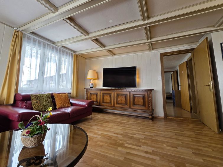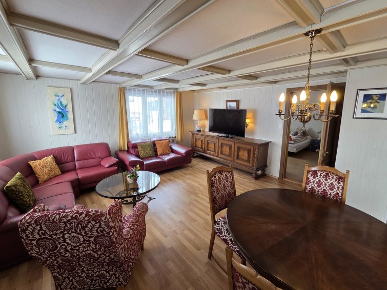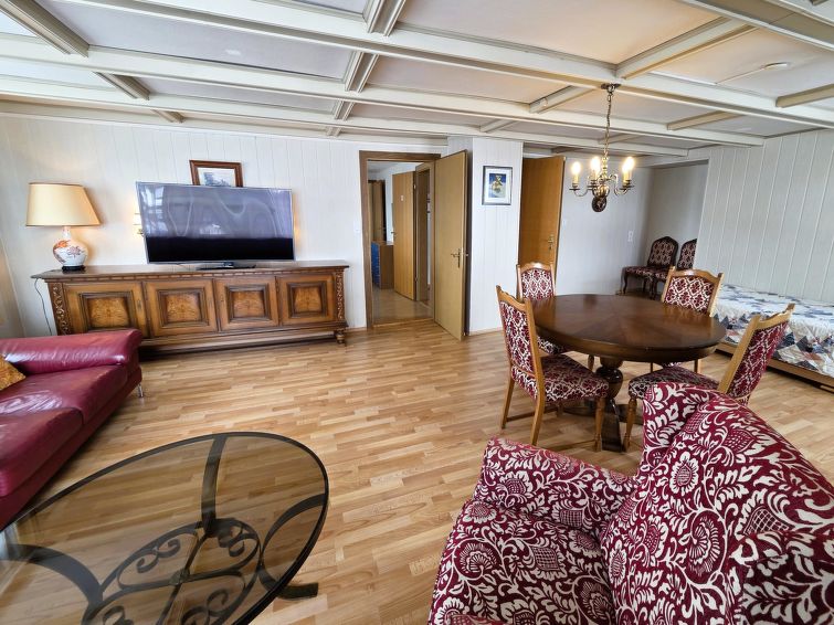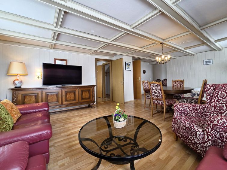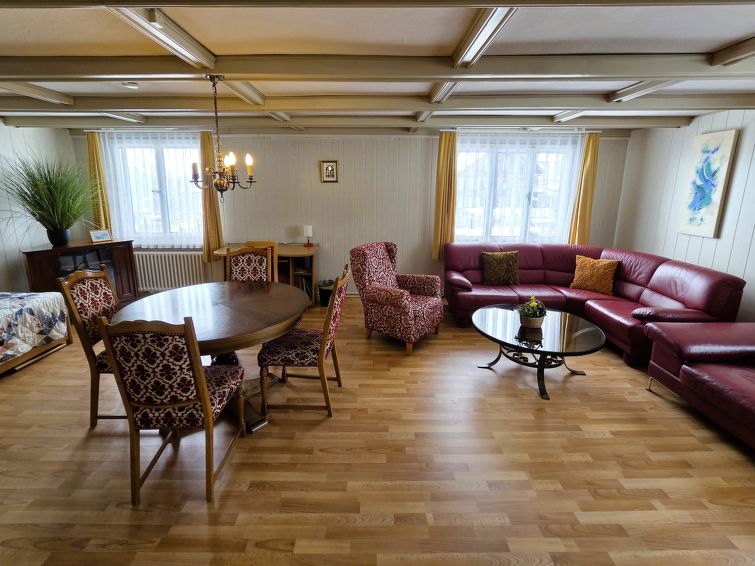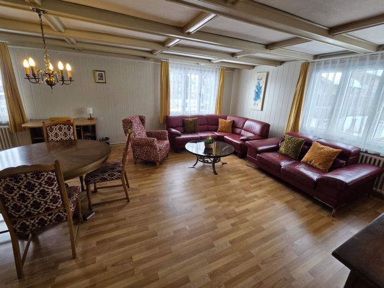 110 m2. mere informasjon fra eieren: Centrally located 5 room apartment on 1st floor, sleeps 6 persons. Big living area with TV/video; Panoramic room with TV/radio, CD, Kitchen with dishwasher, oven with grill, microwave, coffee machine: bathroom with dual basins, tub/shower and toilet. Second toilet and washing machine/tumbler on same floor. Balcony with great view to the mountains (Eiger, Mönch and Jungfrau) and lake Thun. Sheltered car parking available.