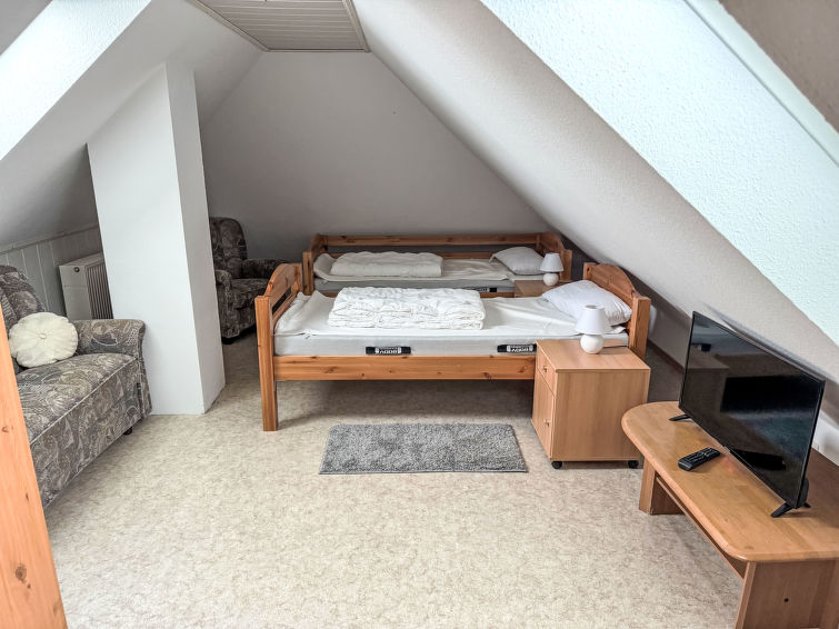4 rom leilighet 140 m2 på 2 etasjer. Koseligt møbler: øverste etasje: stue med skråtak med, kabel-TV og radio. 2 rom med skråtak, hvert rom med, 1 dobbeltseng. Åpent kjøkken (4 kokeplater, stekeovn, brødrister, vannkoker, mikrobølgeovn, elektrisk kaffemaskin). Bad/WC. Toppetasje: 1 rom med skråtak med 2 senger. Dusj/WC. Fasiliteter: høy barnestol barneseng. Internett (trådløs LAN [WLAN], gratis). Vennligst merk: røykfri bolig. Røykvarsler.