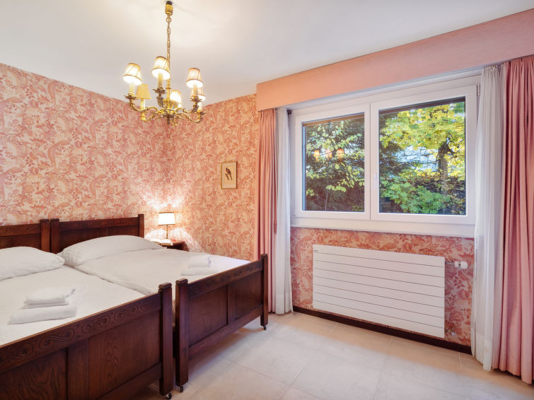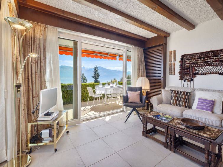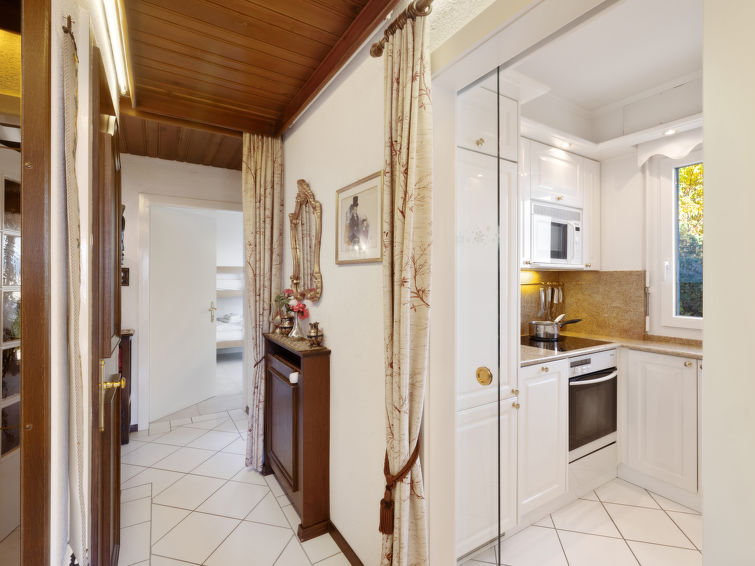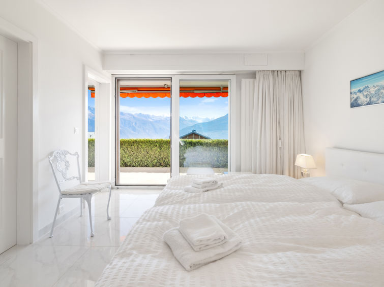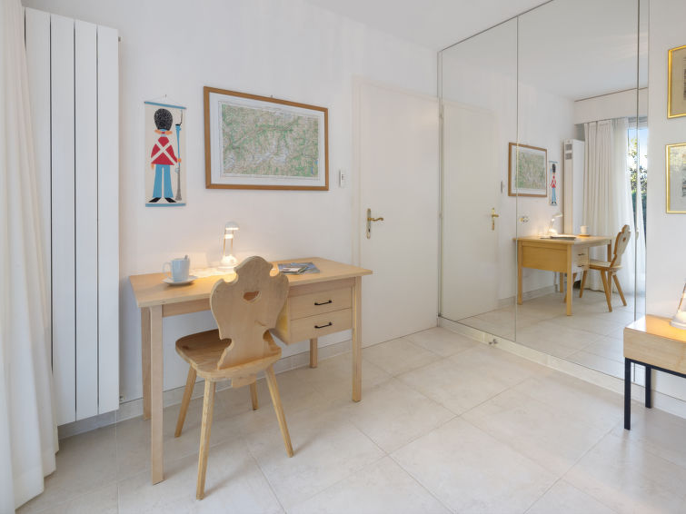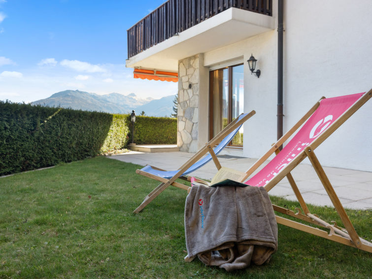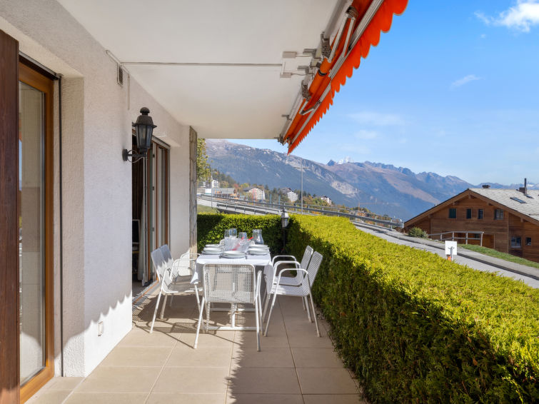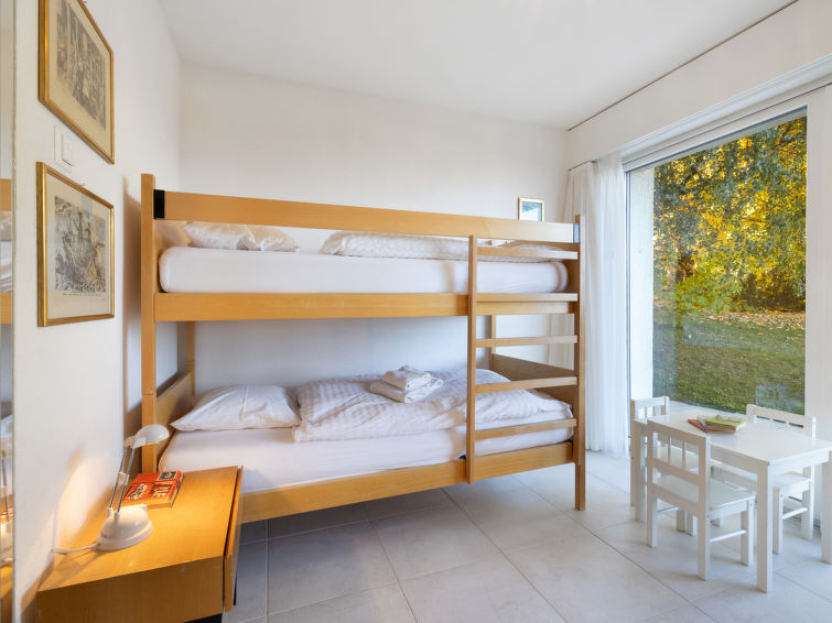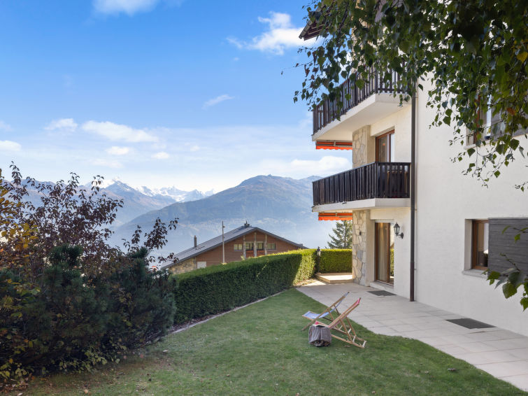 4 rom leilighet 90 m2, i forhøyet bunnetasje, beliggenhet mot sør. Romlig og lys, komfortabelt møbler: liten stue/spisestue med, kabel-TV, flatskjerms TV, DVD og motoriserte persienner. Utgang til terrassen, beliggenhet mot sør. 1 rom med 2 senger (90 cm lengde 190 cm). 1 rom med, 1 x 2 køysenger (80 cm, lengde 190 cm). Utgang til terrassen, til sitteplass i hagen, beliggenhet mot øst. 1 rom med etasjer med, 1 dobbeltseng (2 x 90 cm, lengde 200 cm), kjøkkenhjørne og dusj/WC. Utgang til terrassen, beliggenhet mot sør. Kjøkken (stekeovn, oppvaskmaskin, 4 keramiske kokeplater, brødrister, vannkoker, mikrobølgeovn, frys, elektrisk kaffemaskin, Internet(Nespresso), ekstra, dampgryte, raclettegrill (chinoise, ost)). Bad/WC, sep. WC. Stor terrasse 19 m2, beliggenhet mot sør, sitteplass i hagen 10 m2, østvendt beliggenhet. Terrassemøbler. Vakker god utsikt av fjellene. Fasiliteter: vaskemaskin, tørketrommel, strykejern, hårføner. Internett (trådløs LAN [WLAN], gratis). Garasje plass nr 14S (1 Bil), høyde 195 cm, bredde 235 cm. Vennligst merk: røykfri bolig.