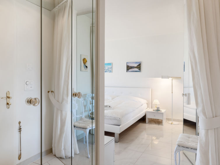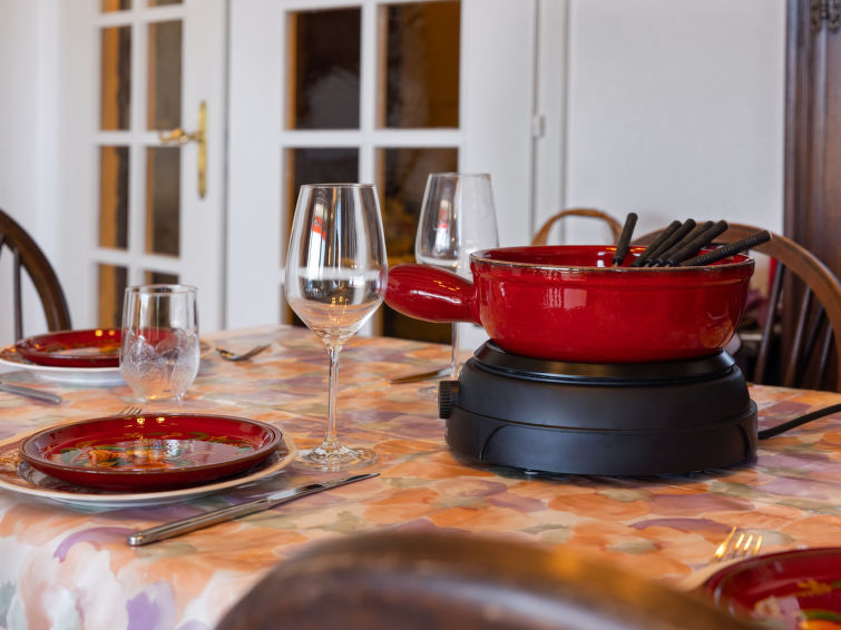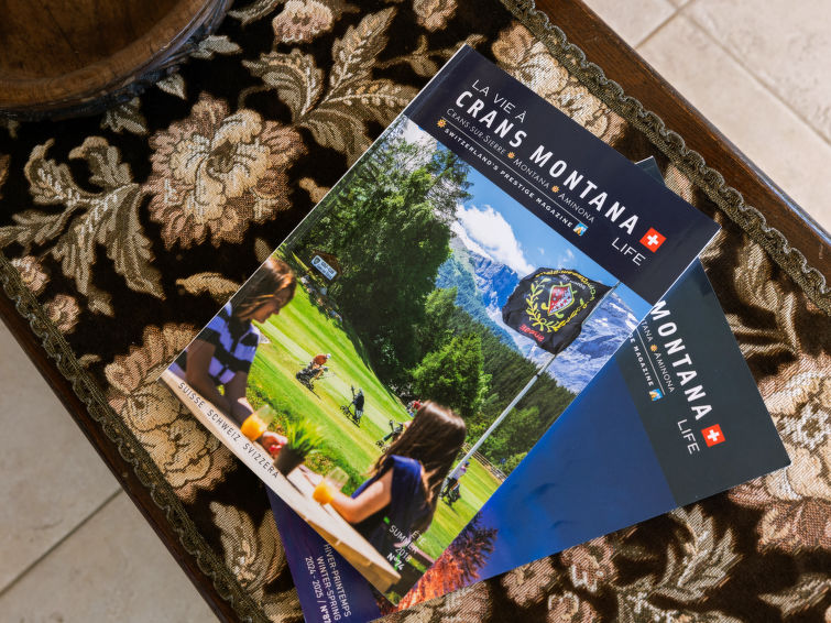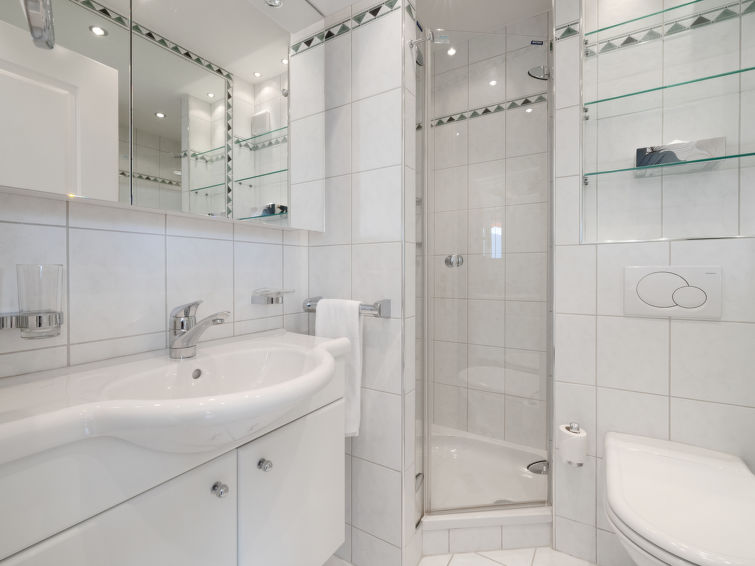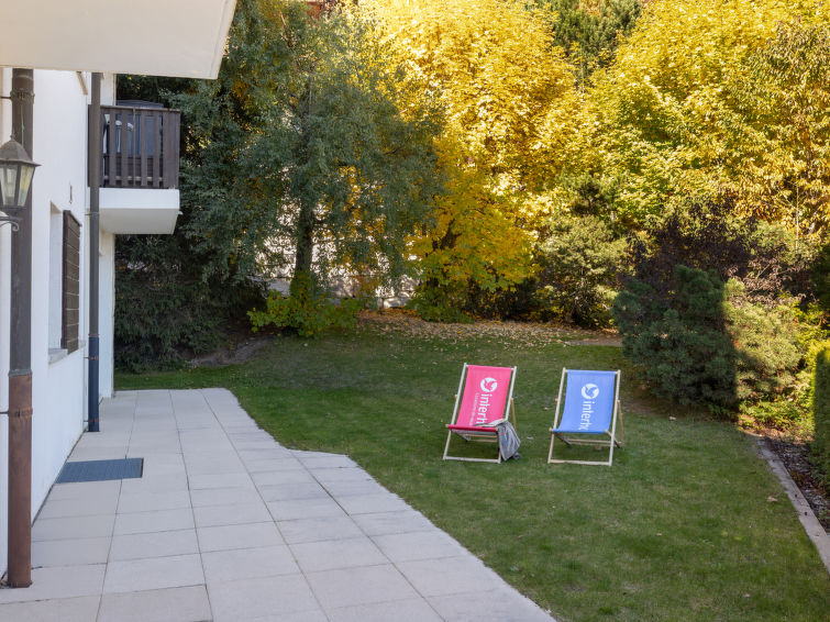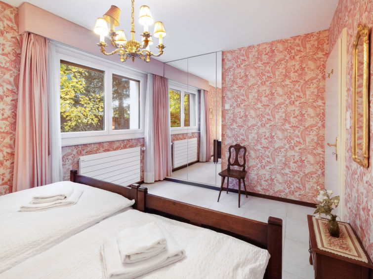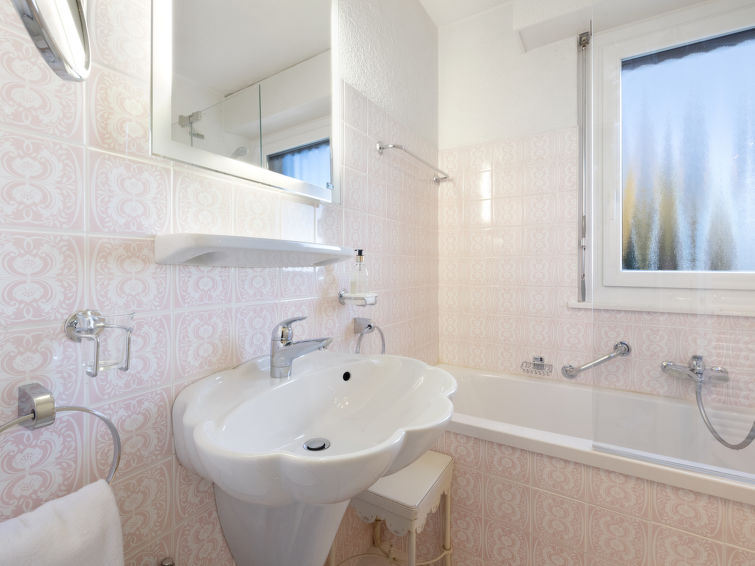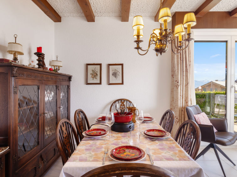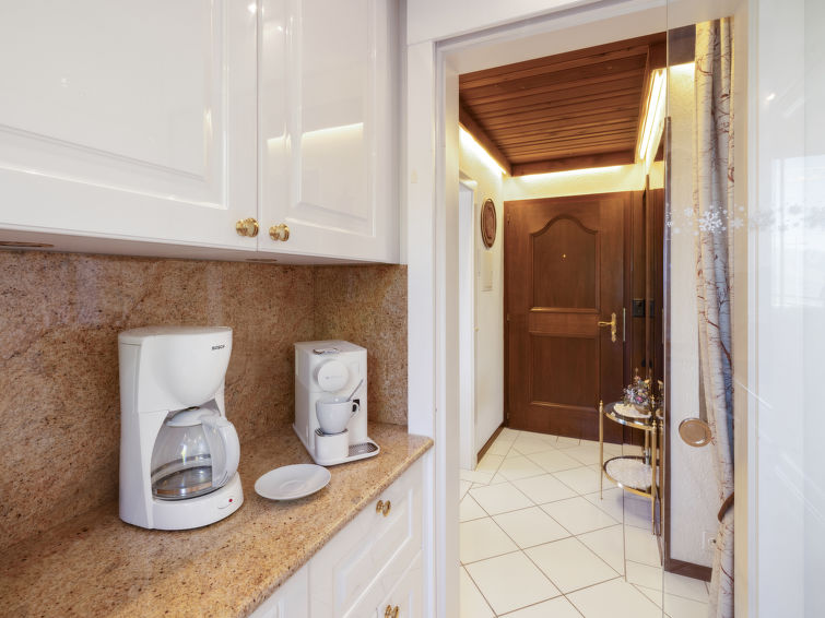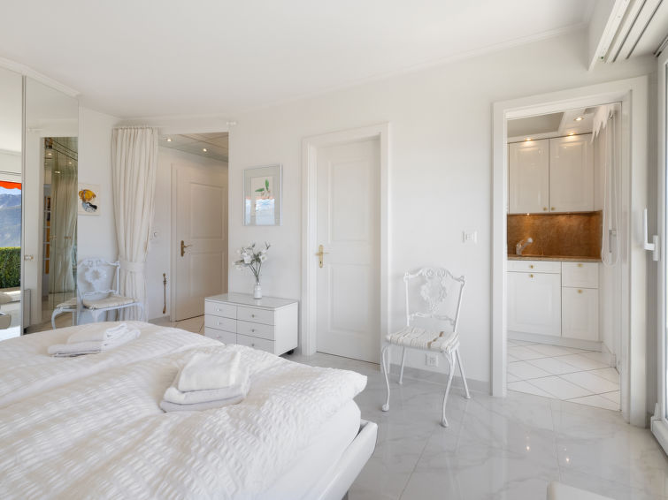 4 rom leilighet 90 m2, i forhøyet bunnetasje, beliggenhet mot sør. Romlig og lys, komfortabelt møbler: liten stue/spisestue med, kabel-TV, flatskjerms TV, DVD og motoriserte persienner. Utgang til terrassen, beliggenhet mot sør. 1 rom med 2 senger (90 cm lengde 190 cm). 1 rom med, 1 x 2 køysenger (80 cm, lengde 190 cm). Utgang til terrassen, til sitteplass i hagen, beliggenhet mot øst. 1 rom med etasjer med, 1 dobbeltseng (2 x 90 cm, lengde 200 cm), kjøkkenhjørne og dusj/WC. Utgang til terrassen, beliggenhet mot sør. Kjøkken (stekeovn, oppvaskmaskin, 4 keramiske kokeplater, brødrister, vannkoker, mikrobølgeovn, frys, elektrisk kaffemaskin, Internet(Nespresso), ekstra, dampgryte, raclettegrill (chinoise, ost)). Bad/WC, sep. WC. Stor terrasse 19 m2, beliggenhet mot sør, sitteplass i hagen 10 m2, østvendt beliggenhet. Terrassemøbler. Vakker god utsikt av fjellene. Fasiliteter: vaskemaskin, tørketrommel, strykejern, hårføner. Internett (trådløs LAN [WLAN], gratis). Garasje plass nr 14S (1 Bil), høyde 195 cm, bredde 235 cm. Vennligst merk: røykfri bolig.