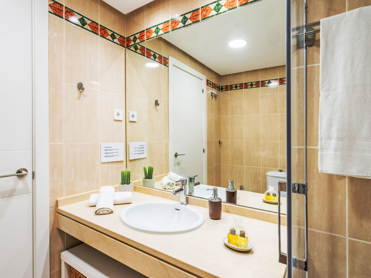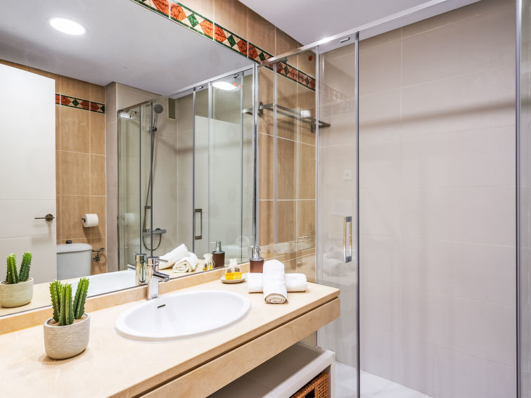 Fin, komfortabel leilighetshus "Mirador del Saltillo". I en roligt, høyt posisjon, 750 m fra sjøen, 750 m fra stranden. Fellesbruk: hage med plen, 2 badebasseng nyre-formet (Sesongåpent: 01.Mai. - 30.Sep.). Barnebasseng, utendørs dusj. I huset: heis. Bussholdeplass 400 m, togstasjon 300 m. Sporthavn 1.5 km, marina 1.5 km. Attraksjoner i nærheten: Puerto Marina 1.5 km, Sea Life 1.5 km, Cocodrile Park 1.5 km, Acualand 1.5 km. Eieren godtar ikke noen ungdomsgrupper. Stille og rolig område. Stillhet og god oppførsel.