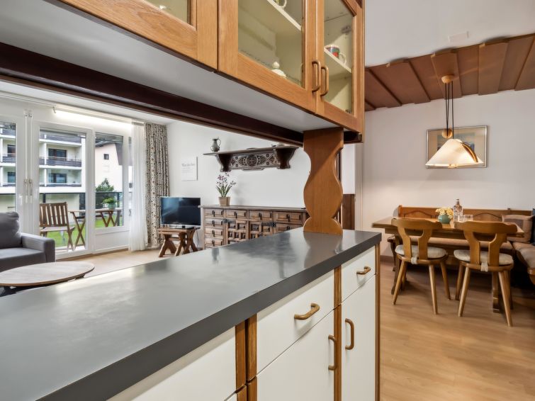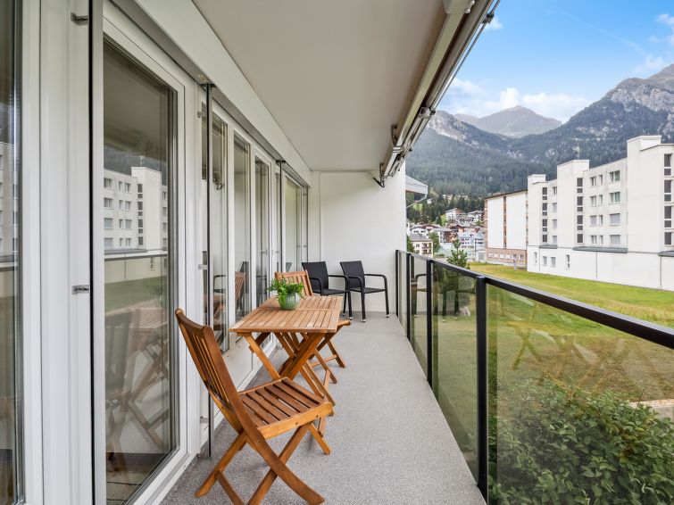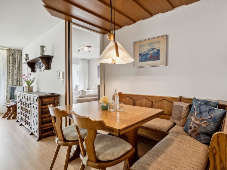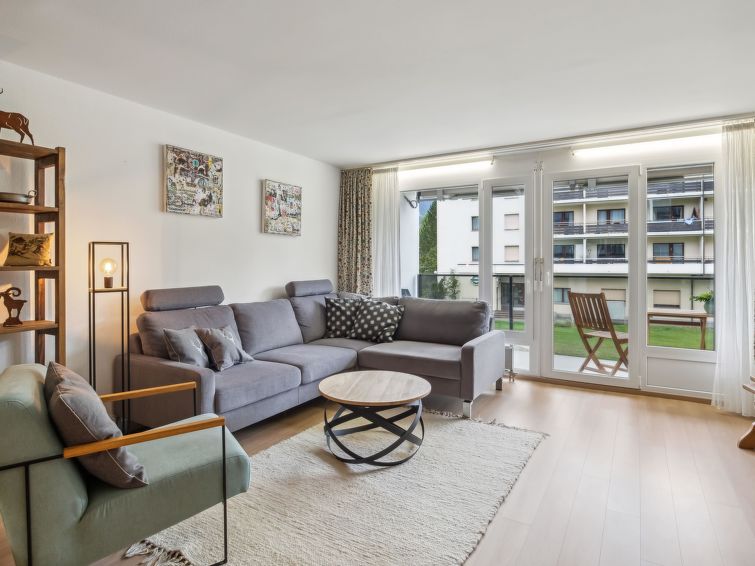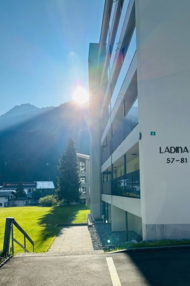 3 ½-room apartment with 5 beds, 2nd floor apartment house Ladina. One bedroom with double bed, the other with 2 single beds and a 3rd bed that can be pulled out. Kitchen with dishwasher integrated in the living room with dining table, sofa, TV, internet, radio and telephone. 68 m2. Carpeted floor. Bathroom, toilet separate. Pets welcome. Sunny south-facing balcony.
