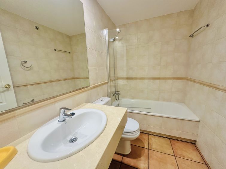 "Port Pals FIII", 3 rom leilighet i 2nd etasje. Praktiskt møbler: stue/spisestue med, digital TV. Utgang til terrassen. 1 rom med, 1 dobbeltseng (150 cm, lengde 190 cm), bad/WC. 1 rom med 2 senger (80 cm lengde 190 cm). Åpent kjøkken (oppvaskmaskin, 4 keramiske kokeplater, mikrobølgeovn, elektrisk kaffemaskin). Bad/bidé/WC. Vannkoker (100 liter). Oppvarmingsalternativ. Stor terrasse. Terrassemøbler. Utsikt av havet. Fasiliteter: vaskemaskin, strykejern, høy barnestol barneseng, hårføner. Internett (trådløs LAN [WLAN], gratis). Parkeringsplass plass nr 28 exterior. Vennligst merk: bare TV ES. HUTG-011816
