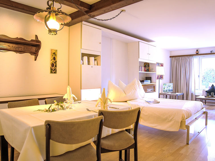 "Residenz Surlej 6", 1 rom leilighet 60 m2, i forhøyet bunnetasje. Praktiskt og rustikt møbler: stue/soverom med, 1 dobbel skapseng (1 x 150 cm, lengde 200 cm), dusj/bidèt/WC og TV (flatskjerms TV). Utgang til terrassen, beliggenhet mot sør. Lite kjøkken (3 kokeplater, stekeovn, oppvaskmaskin, brødrister, vannkoker, elektrisk kaffemaskin). Vakker utsikt av fjellene. Fasiliteter: hårføner. Internett (trådløs LAN [WLAN], gratis). Garasje plass nr 6, høyde 195 cm, bredde 235 cm. Vennligst merk: røykfri bolig.
