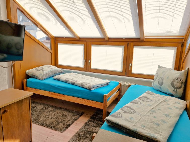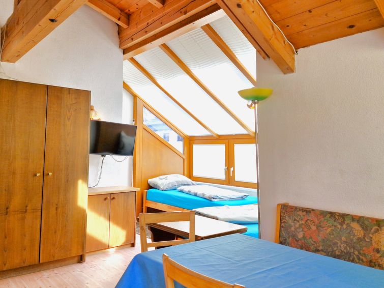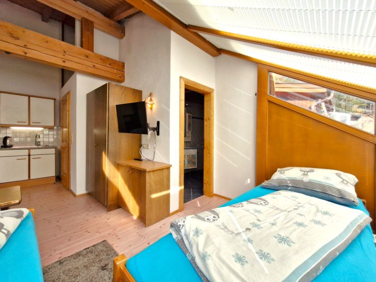 "Rosi (SOE302)", 1 rom leilighet 35 m2, i toppetasjen. Lys: øverste etasje: stue/soverom med 2 senger, spisehjørne og satelit-TV. Utgang til balkongen. Kjøkkenkrok (4 kokeplater, mikrobølgeovn, elektrisk kaffemaskin). Dusj/WC. Oljeoppvarming. Vennligst merk: røykfri bolig. Max kjæledyr/små hunder tillatt 2 kjæledyr/små hunder tillatt.