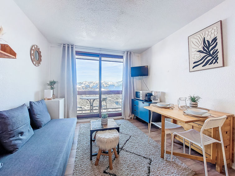 1 rom etromsleilighet 22 m2 i 11st etasje, beliggenhet mot nord. Komfortabelt og vakkert møbler: stue/spisestue med, 1 dobbel sovesoffa (130 cm, lengde 190 cm), 1 x 2 køysenger (90 cm, lengde 190 cm), TV (flatskjerms TV), DVD. Utgang til balkongen. Kjøkkenkrok sammen med ingangen (miniovn, 2 keramiske kokeplater, brødrister, vannkoker, mikrobølgeovn, elektrisk kaffemaskin, Internet(Nespresso Magimix), ekstra, raclettegrill (ost)). Dusj/WC. El-oppvarming. Parkett. Balkong 4 m2, beliggenhet mot nord. Terrassemøbler. Meget vakker utsikt av fjellene og dalen. Fasiliteter: strykejern, hårføner. Vennligst merk: røykfri bolig. Kjæledyr / hund tillatt 1 kjæledyr / hund tillatt. Bare TV FR. Røykvarsler. Tilbud fra en privatperson i henhold til art. 155, IV av CGI.