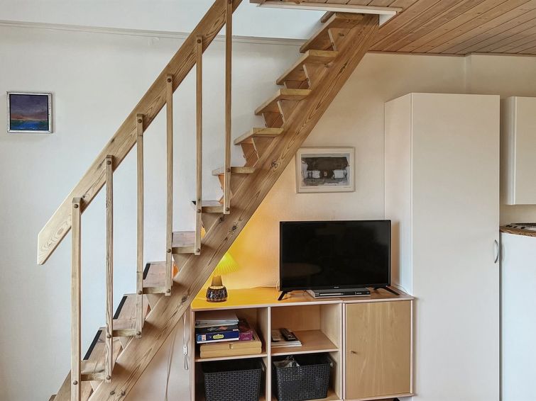 "Steffi" - 300m from the sea in Bornholm", leilighet 35 m2. Passer for 2 voksne. Åpen stue galleri med, 1 dobbel sovesoffa, 1 dobbeltseng, TV, radio og DVD. Kjøkken (stekeovn, 4 keramiske kokeplater, mikrobølgeovn). Dusj/WC. Grill. Utsikt av havet. Parkeringsplass ved hbrukt. Vennligst merk: røykfri bolig.