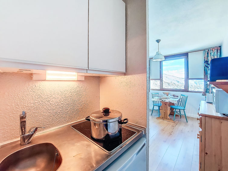 1 rom etromsleilighet 16 m2 i 11st etasje, beliggenhet mot nord. Vakkert møbler: stue/spisestue med, 1 uttrekkbar seng (2 pers. 2 x 80 cm, lengde 190 cm), TV (flatskjerms TV). Kjøkkenkrok (2 kokeplater, miniovn, vannkoker, mikrobølgeovn, elektrisk kaffemaskin). Bad/WC. El-oppvarming. Parkett. Vakker utsikt av fjellene og dalen. Fasiliteter: Internett (trådløs LAN [WLAN], ekstra). Vennligst merk: røykvarsler. Tilbud fra en privatperson i henhold til art. 155, IV av CGI.
