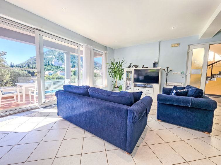 3 rom leilighet 110 m2, på bakkeplan. Stue/spisestue med, satelit-TV og air-conditioning. Utgang til terrassen. 1 rom med, 1 dobbeltseng (160 cm, lengde 200 cm), dusj/WC og air-conditioning. Utgang til terrassen. 1 rom med, 1 dobbeltseng (160 cm, lengde 200 cm), dusj/WC, boblebad og air-conditioning. Utgang til terrassen. Åpent kjøkken (4 kokeplater, stekeovn, oppvaskmaskin, brødrister, vannkoker, mikrobølgeovn, frys) med, spisebord. Sep. WC. Terrasse 30 m2, dekt. Terrassemøbler. Vakker utsikt av havet og viken. Fasiliteter: vaskemaskin, safe, strykejern, myggnett, hårføner. Internett (trådløs LAN [WLAN]). Vennligst merk: røykfri bolig.