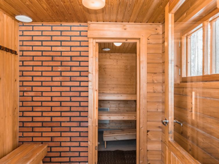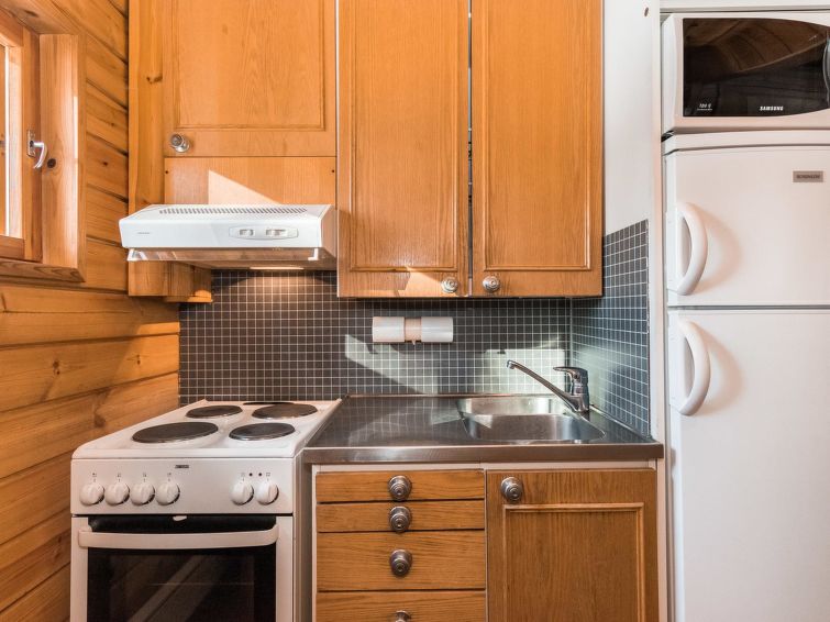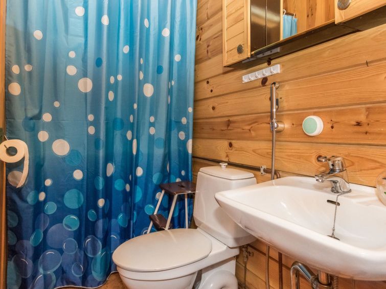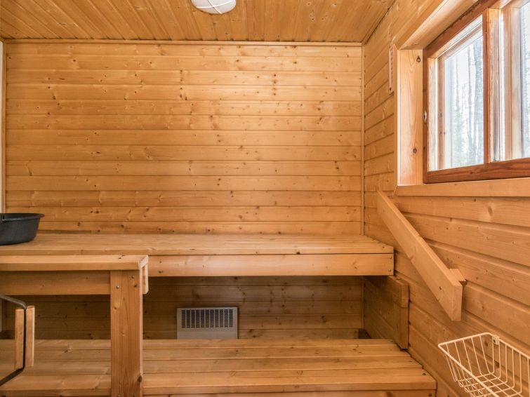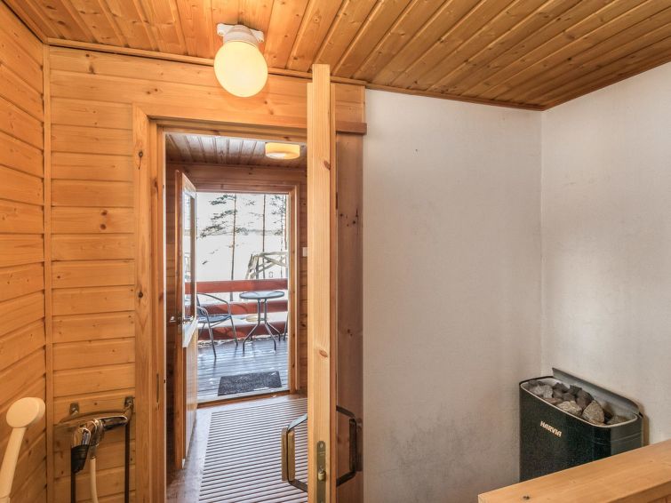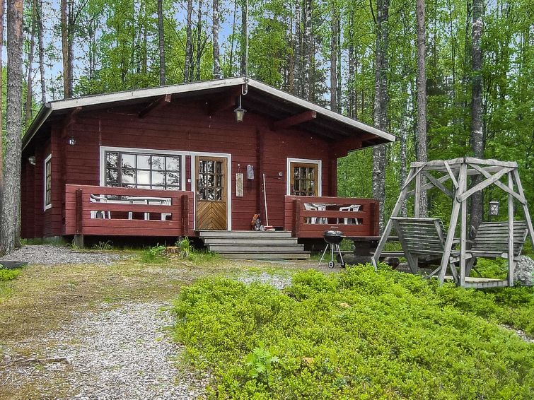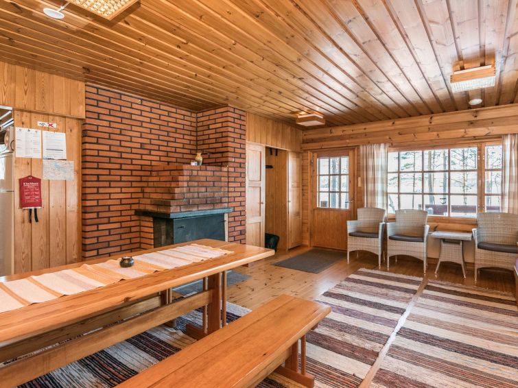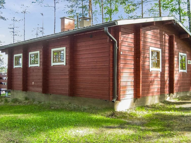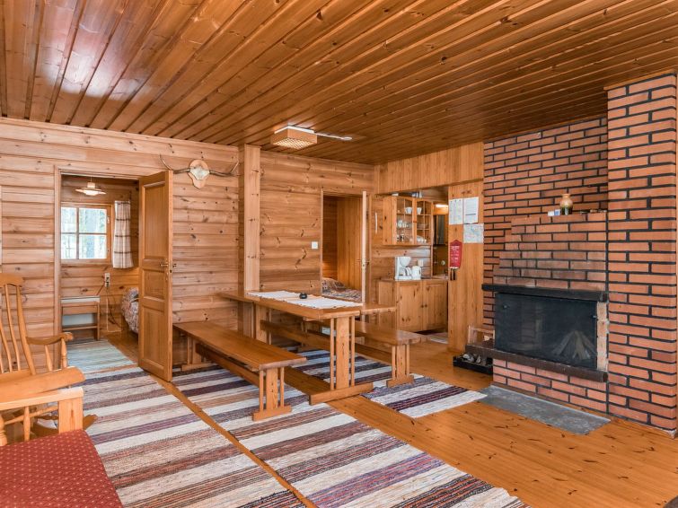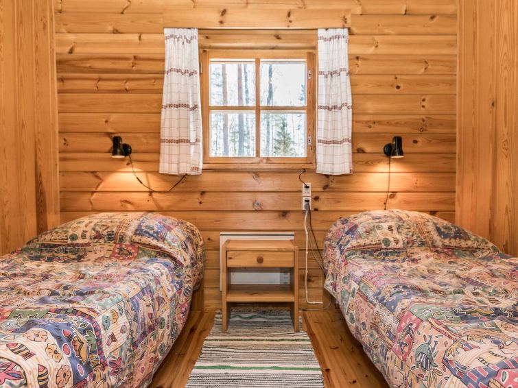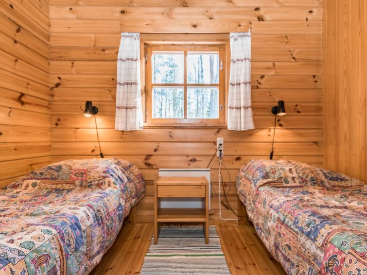 Log cabin, renovated 1992, kitchen, 2 bedrooms with 2 beds in each, living room with 2 extra beds (couch), sauna (electric sauna stove), dressing room, open veranda. Drinking water will be fetched from owner.