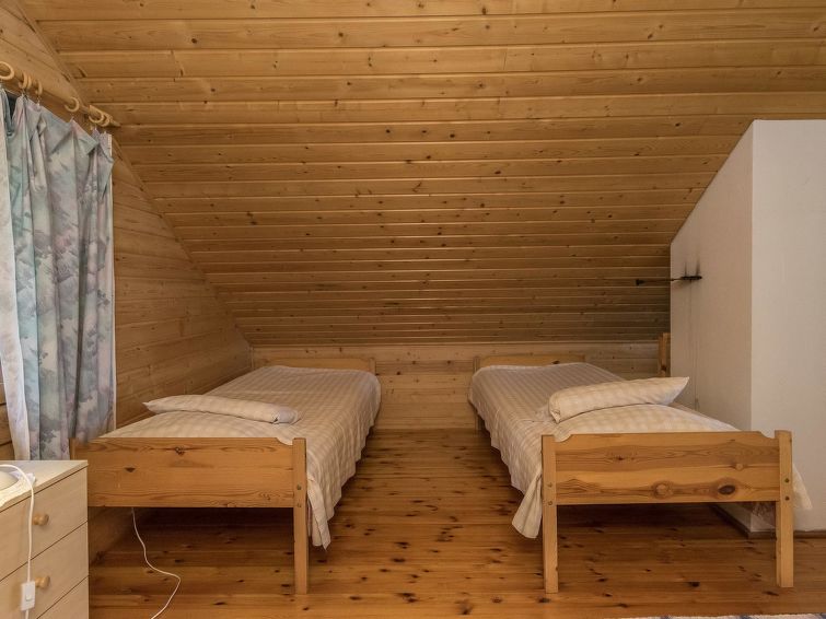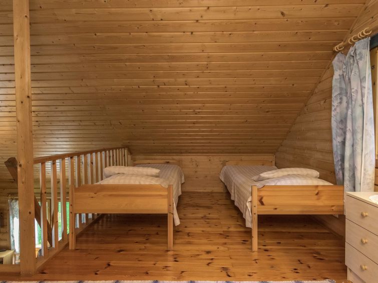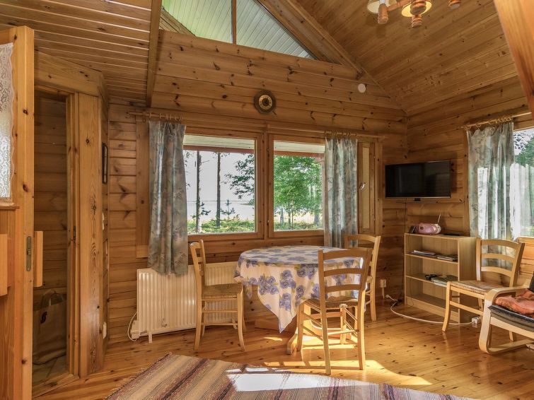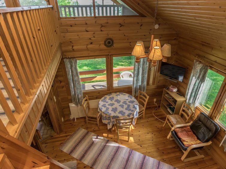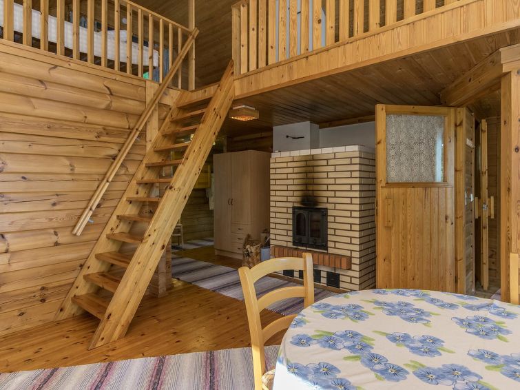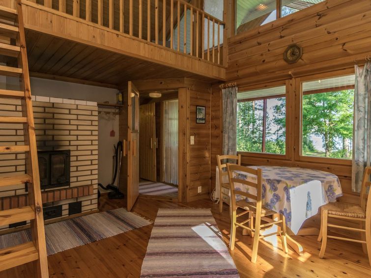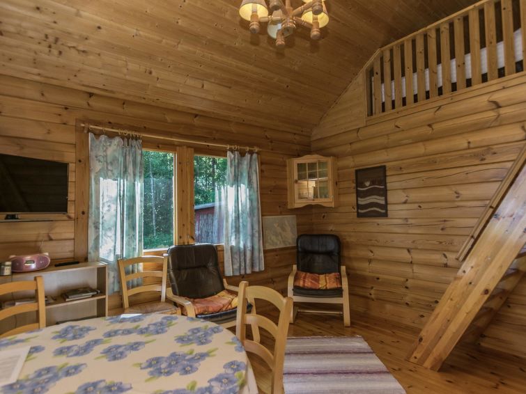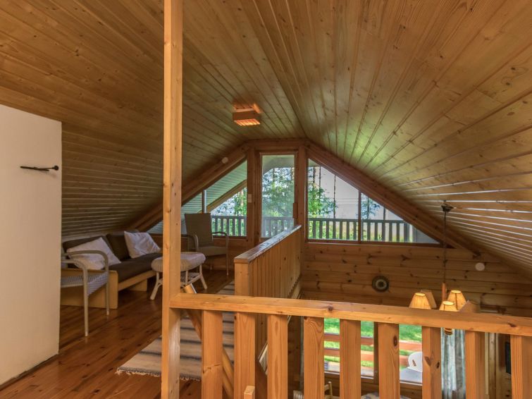 Log cabin 1993, kitchen, living room, bedroom with 2 beds, sleeping loft (steep stairs) with 4 beds, washroom, sauna, toilet, veranda, balcony. Basic equipped peaceful rental cottage on a grass plot.