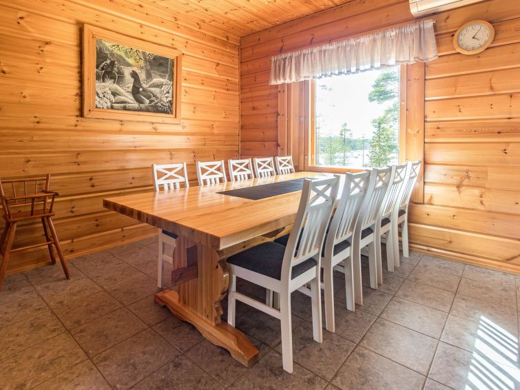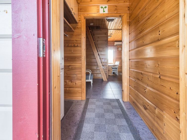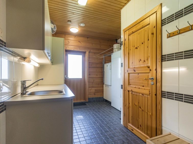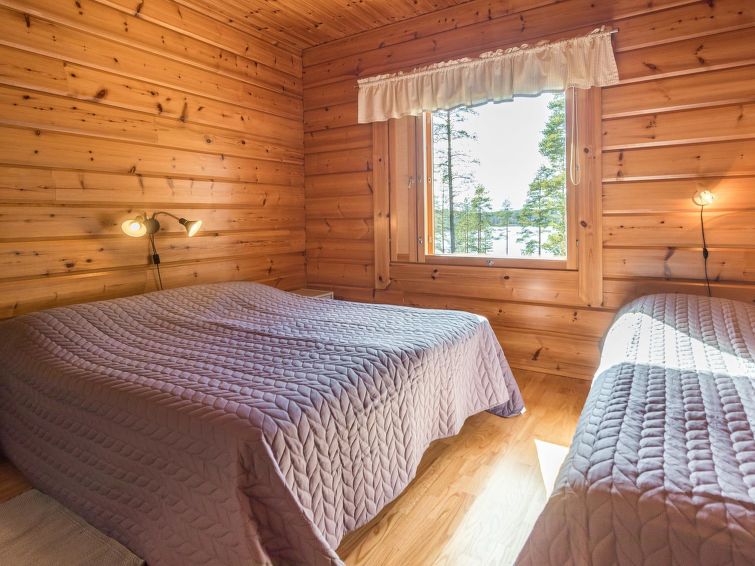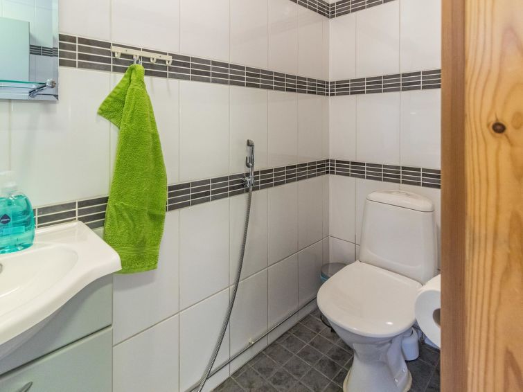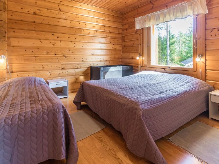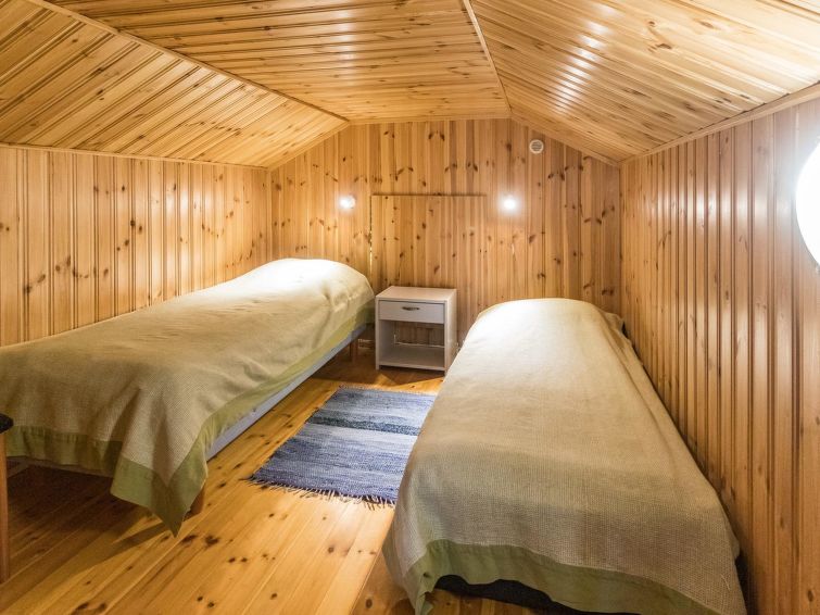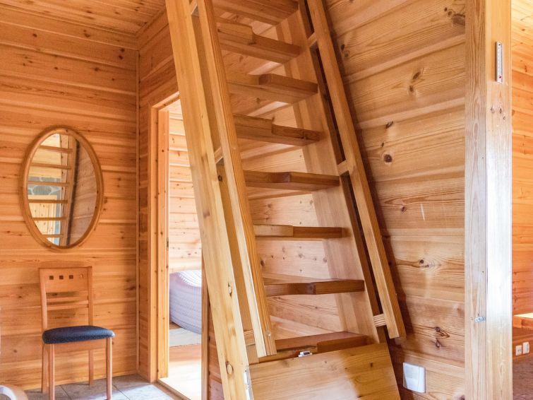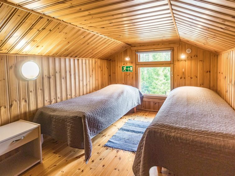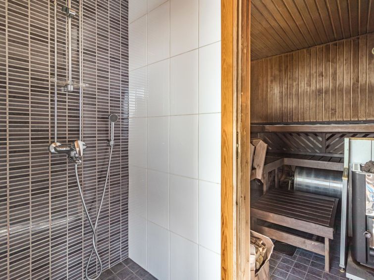 Wooden house 2007, kitchen, living room, bedroom 2 beds, 2nd bedroom 3 beds, 3rd bedroom 3 beds + cot, sleeping loft (20m²) 4 beds, utility room, washroom, sauna (electric stove) with 2 showers, roofed terrace. Steep stairs to loft. House has mechanical ventilation.