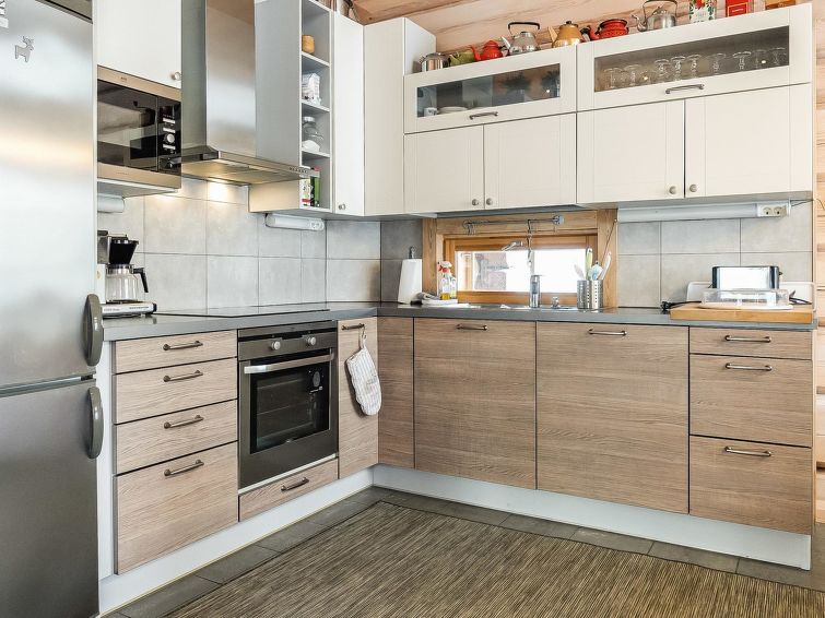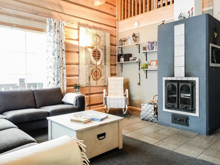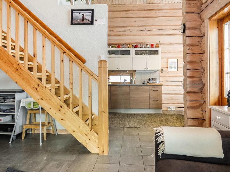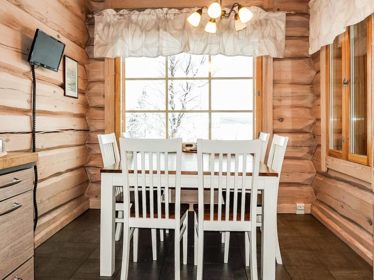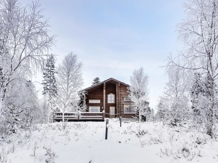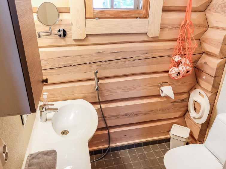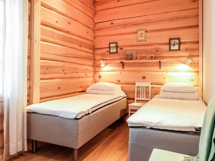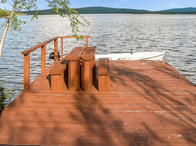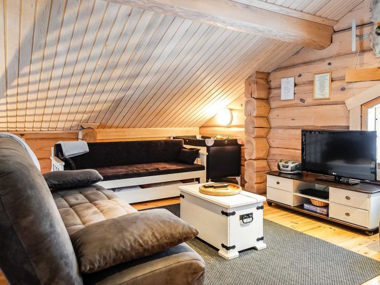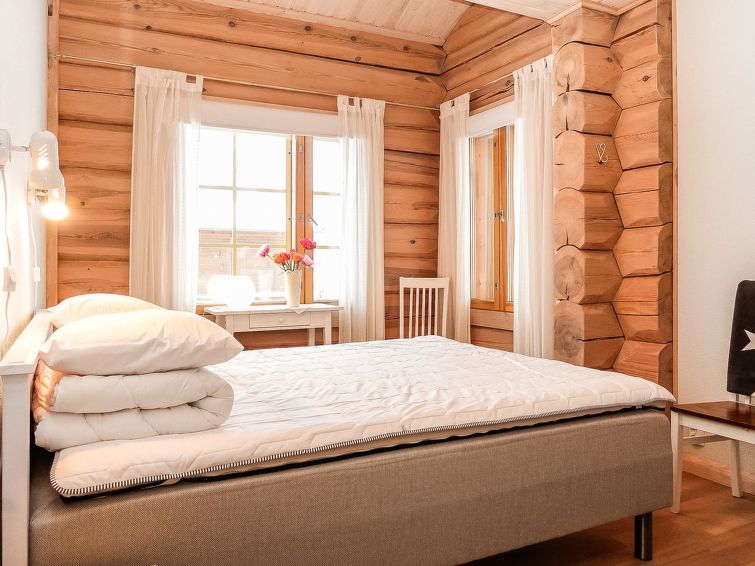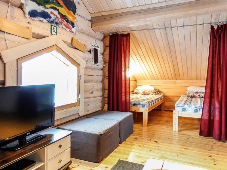 Beautifully situated massive log cabin built in 2011 by lake Inarijärvi on the shore of Nanguvuono. Good, sandy beach 30 m from cabin, jetty, rowing boat, outboard motor 2,2 hp for rent. Combined kitchen-livingroom, bedroom with double bed, bedroom with 2 beds, sleeping alcove on the loft (curtain at the doorway) with 2 beds, loft (15 sqm) with 2 sofa beds and 2 extra beds. Tumble dryer. Electric sauna in the same building. Two showers. Inhouse wc and outhouse wc. Area of the cabin 108 m² of which 15 m² on the loft.