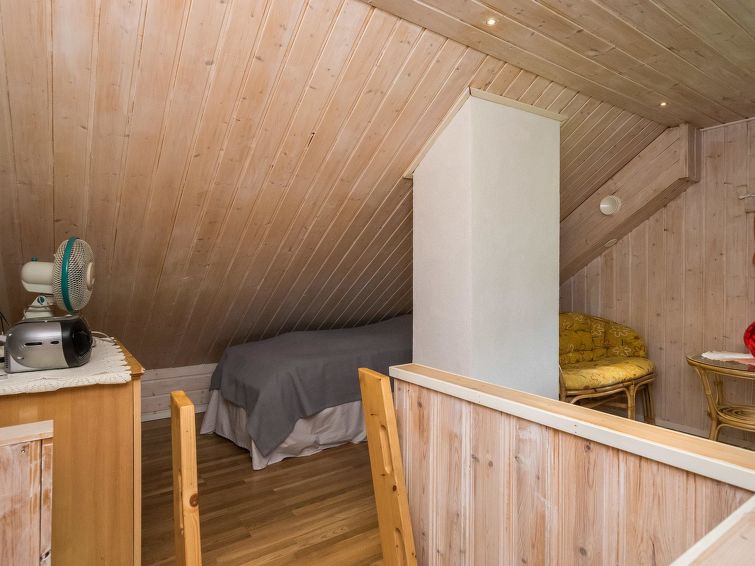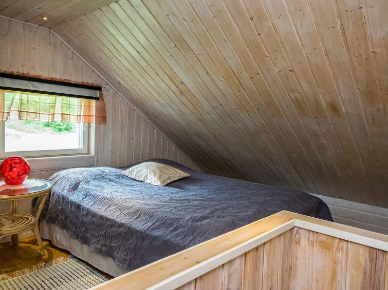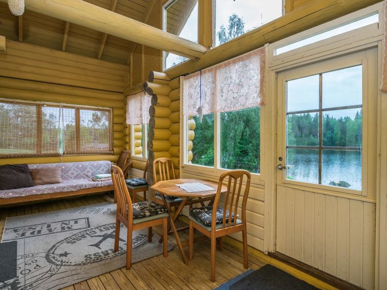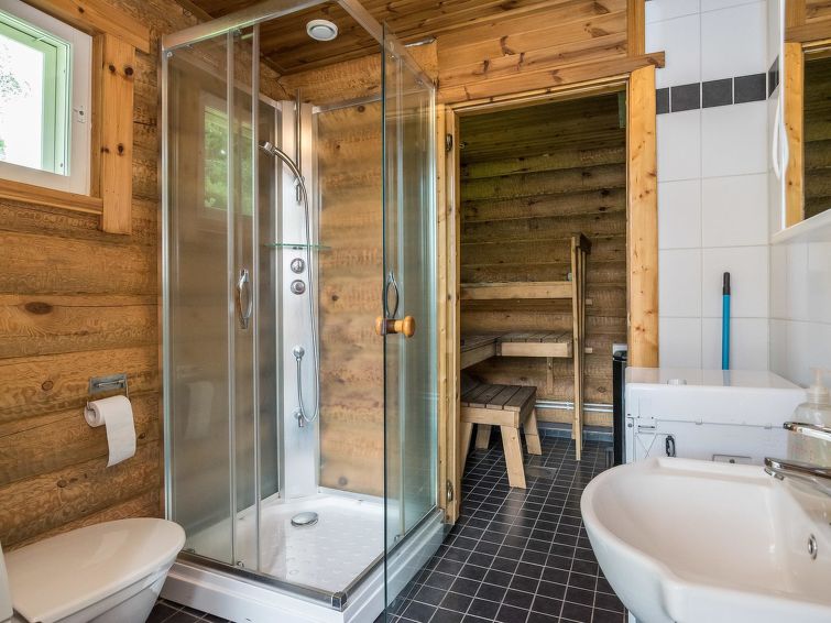 Round logs cabin, built 2011, livingroom/kitchen, sleeping loft with 3 beds, bathroom with shower cubicle, sauna with wood heated stove, glass terrace. Access to sauna through terrace. Stepladders to loft, no sight from the loft down.