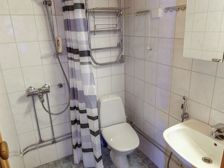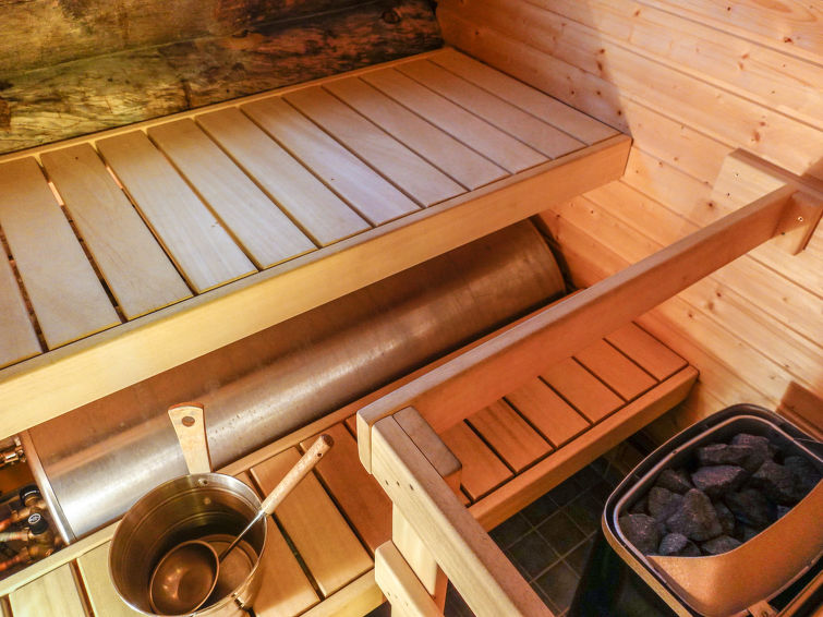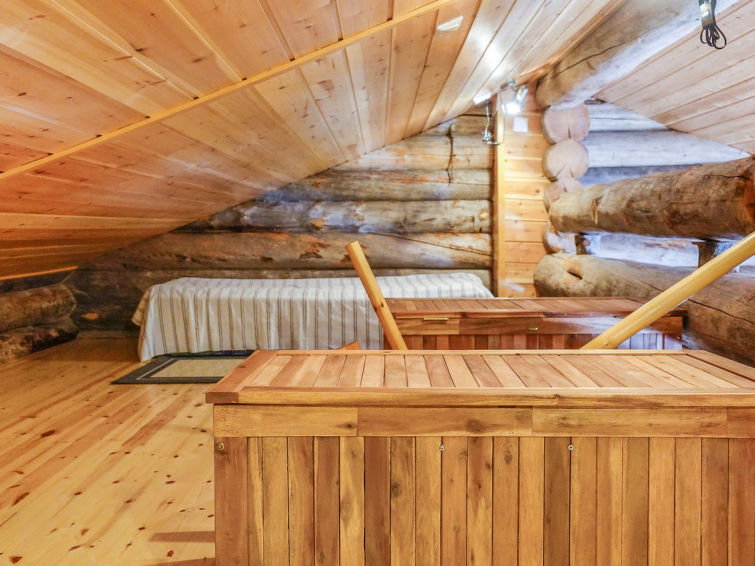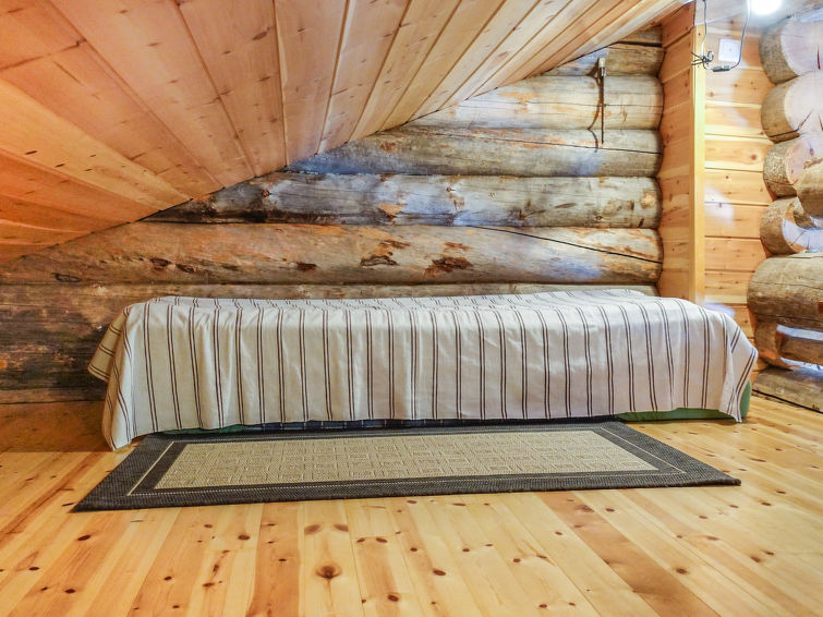 Living room/kitchen, double bed in the bedroom, four mattresses on the loft, steep stairs to the loft, sauna and washroom/WC.