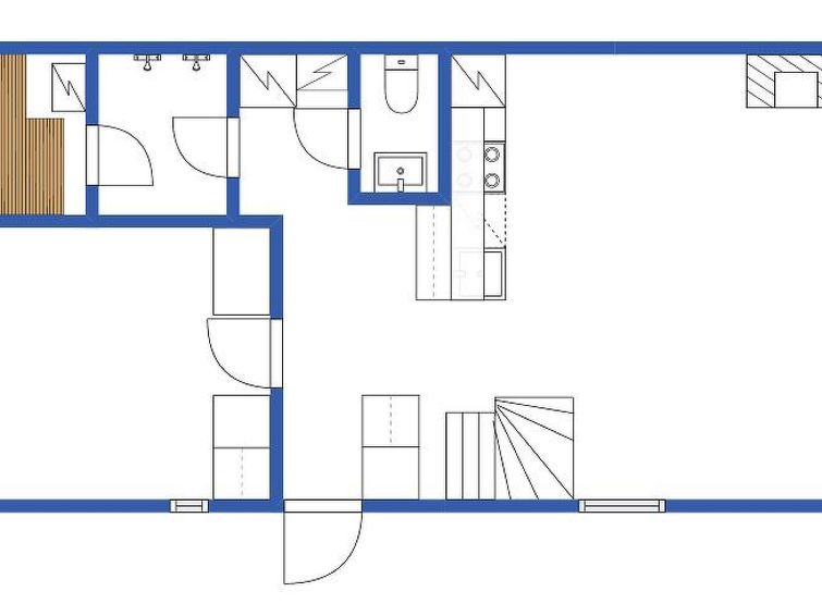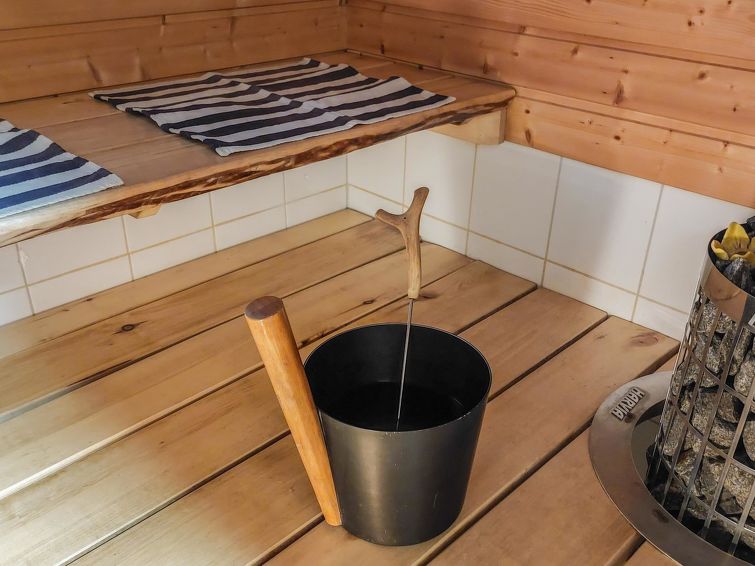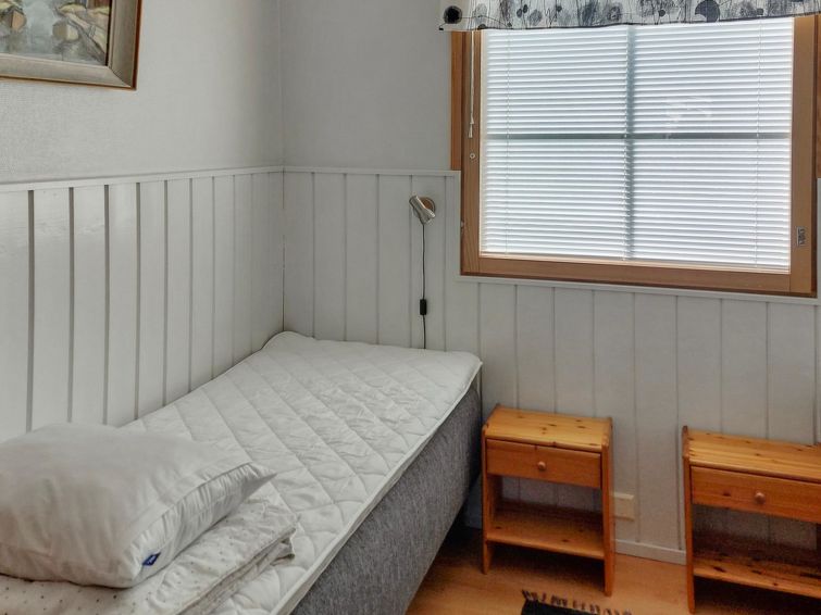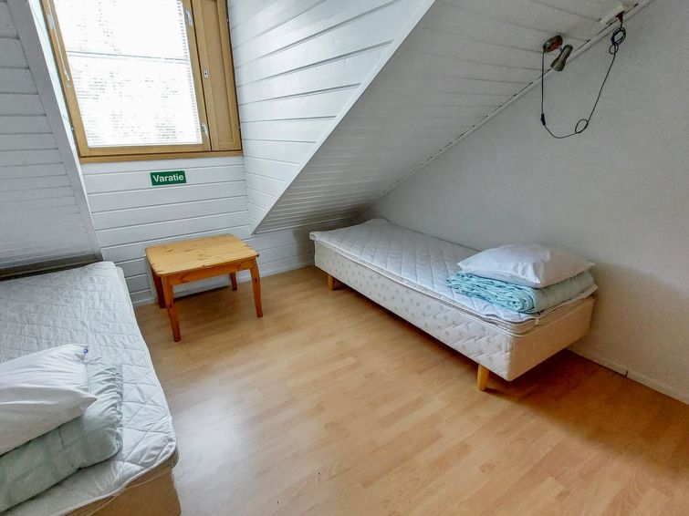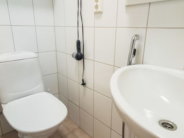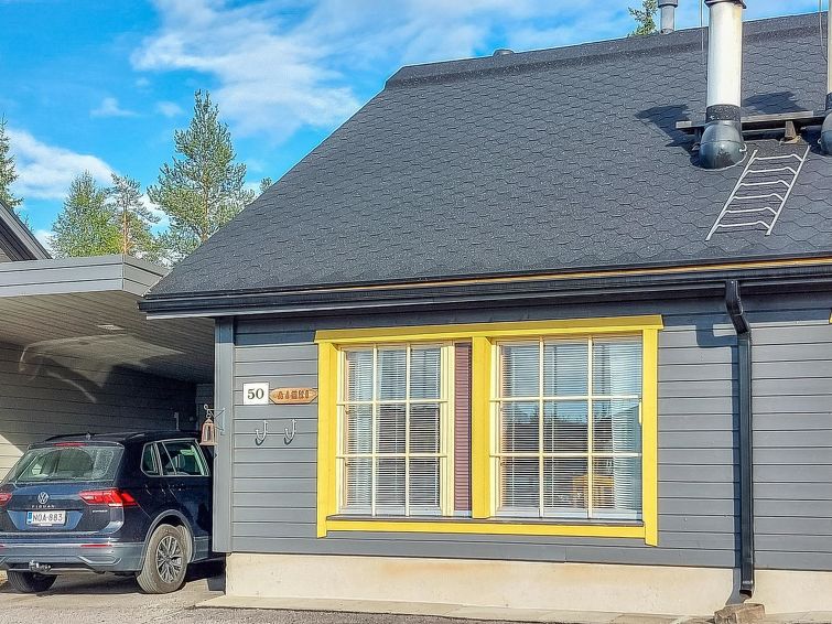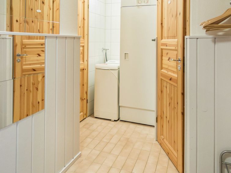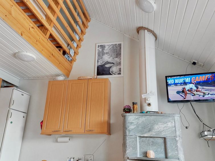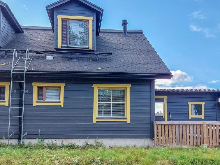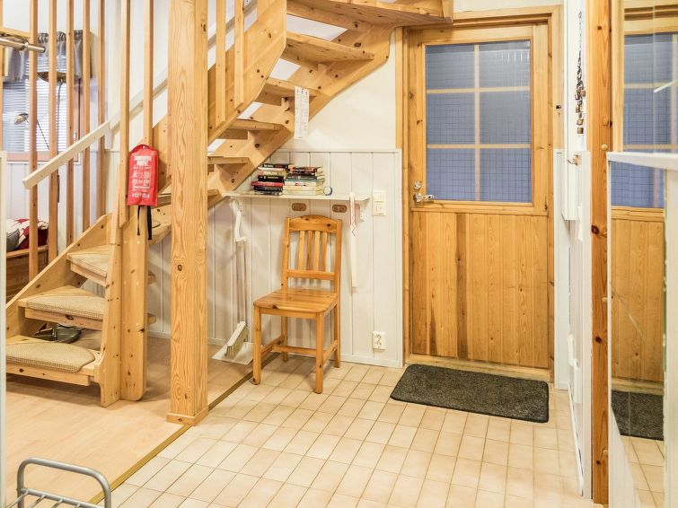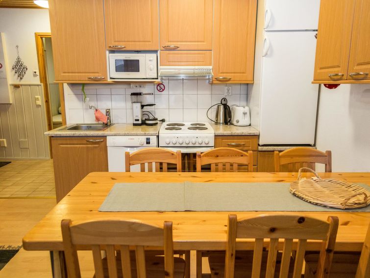 40 km North of Kolari, in the center of Äkäslompolo village. River Kesänkijoki nearby, lake Äkäslompolo 0,3 km, swimming beach. Log duplex apartment, built 2002. Livingroom/kitchen with a bed sofa for two, one bedroom downstairs with 2 separate beds, loft with bedroom with two separate beds, and an extra bed. Electric sauna, washing room, toilet, separate toilet on the loft. Area 59 m² of which 15 m² upstairs. Heated ski maintenance room and car shelter. Well-equiped duplex apartment in the Äkäslompolo village center near the services. The apartment is located near skiing tracks. No pets allowed. Prices include final cleaning, bed linen available for rent.