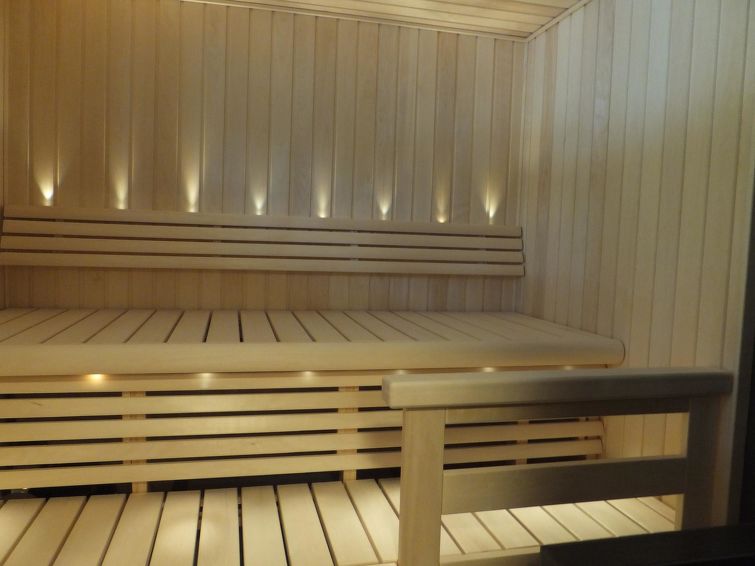 The cottage has spacious living area with fireplace, sofa set and dining set. The kitchen is equipped with modern equipment. Sauna has wood stove and window. Upstairs loft has also lack-out blinds and spring mattresses. From dressing room there is door to spacious veranda with wooden furnishings.
