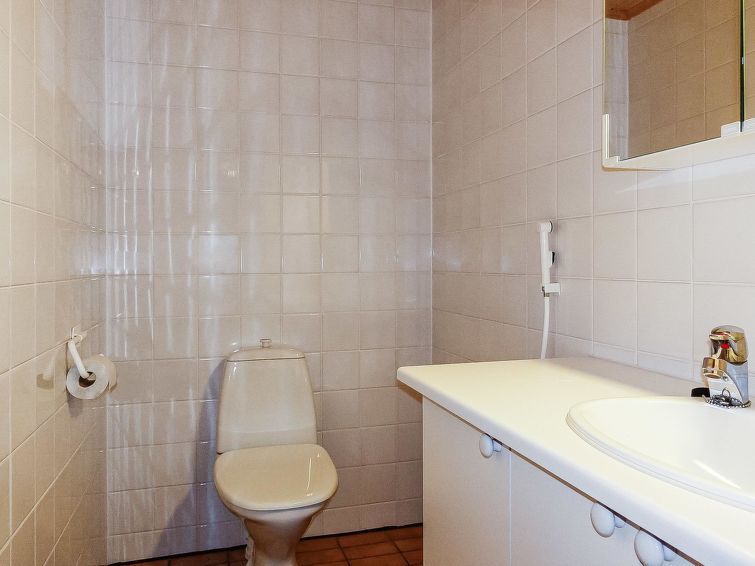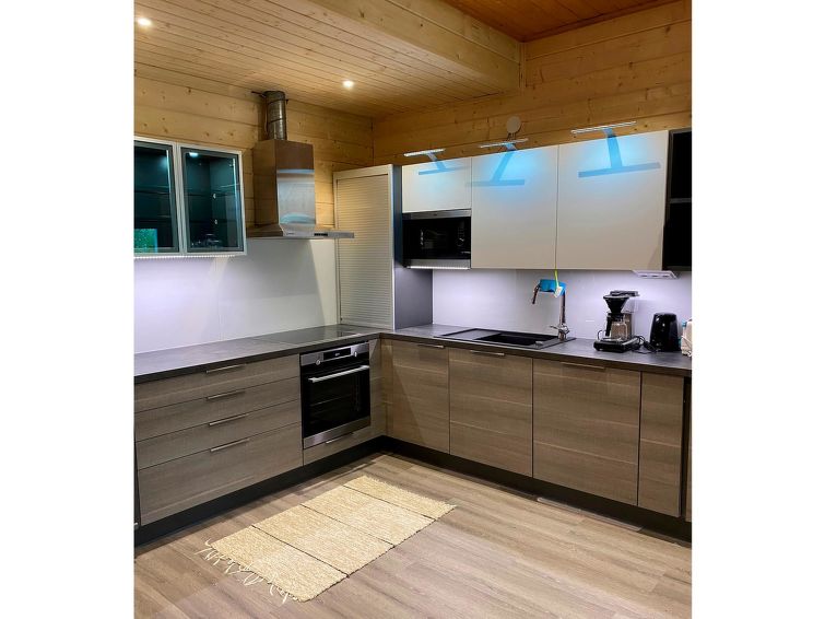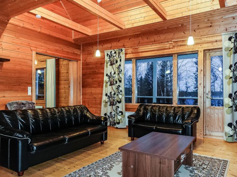 Planed log cottage (one half of semi-detached house unit) on 3 floors, built in 1996. Downstairs: sauna, washroom, large lounge, convertible sofa/bed in lounge, terrace. Middle floor: living room/kitchen, bedroom double bed, bedroom 1 bed, balcony. On the sleeping loft (steep stairs) 3 beds.