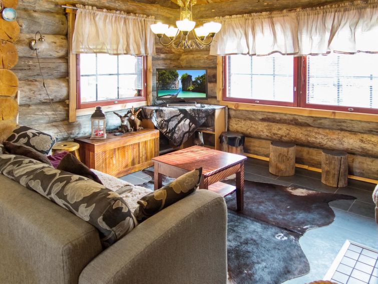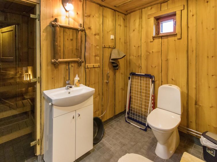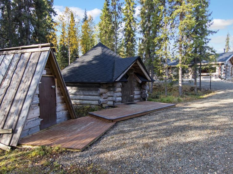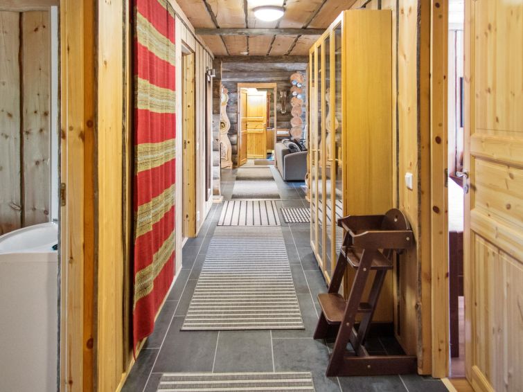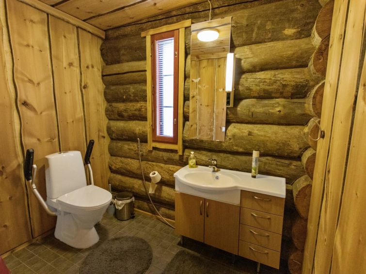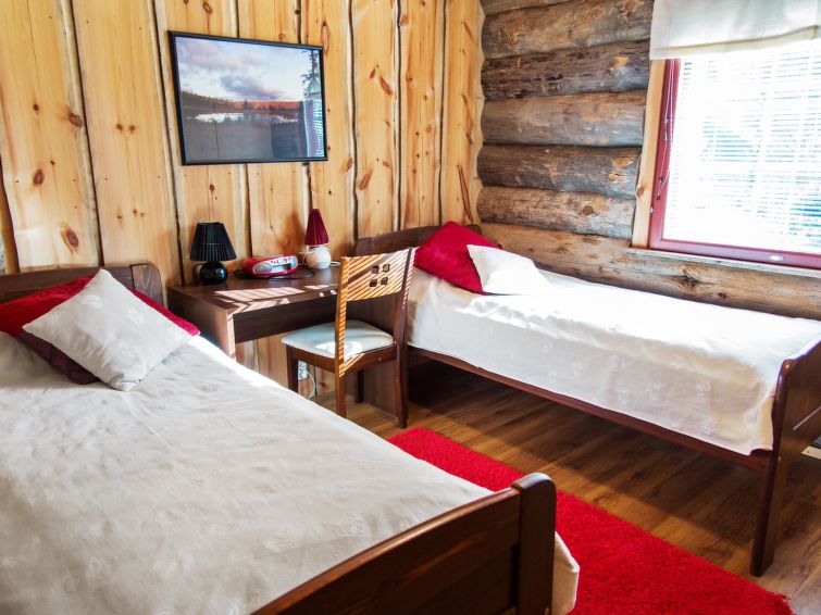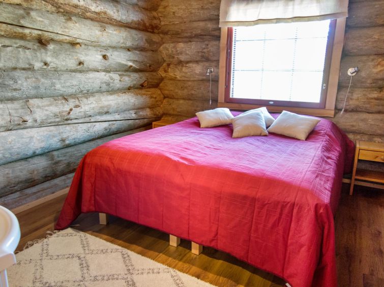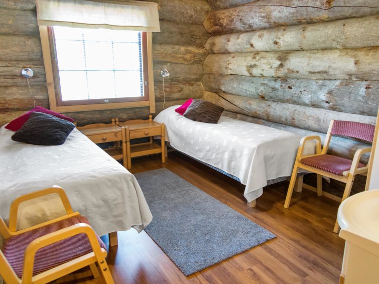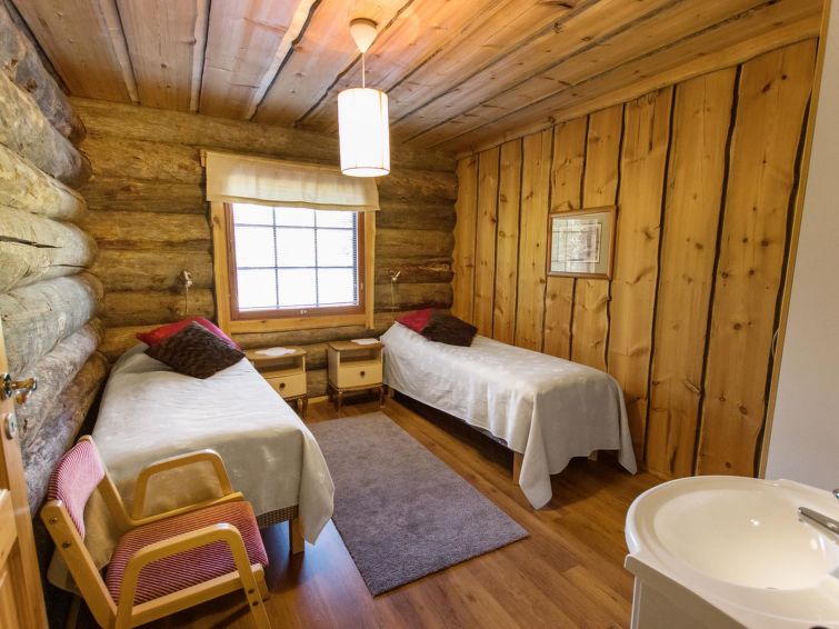 33 km north of Kolari. A log cabin, build 2012 close to the beach of Äkäsriver. Total 5 bedrooms. 3 bedrooms with two separate beds (width 80 cm )in each, one bedroom with 2 separate beds ( width 90 cm, a little bit higher beds than normal), one bedroom with double bed ( width 140 cm), kitchen/living room, two toilets, washroom, sauna (electric), fire Place, internet A cozy log cabin in a quiet location. Cottage is suitable for clients with physical disabilities. A kitchen hut. Also a sauna hut. To the Äkäsriver approx. 80 m. Pets are allowed. Extra fee for pets. Final cleaning is included in the price. Bed linen are available for rent. Reservations start at 16.00 and end at 10.00 (also in weekend bookings). During high season change day is Sunday.