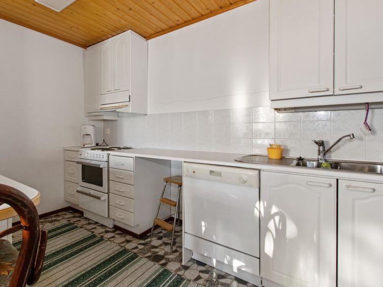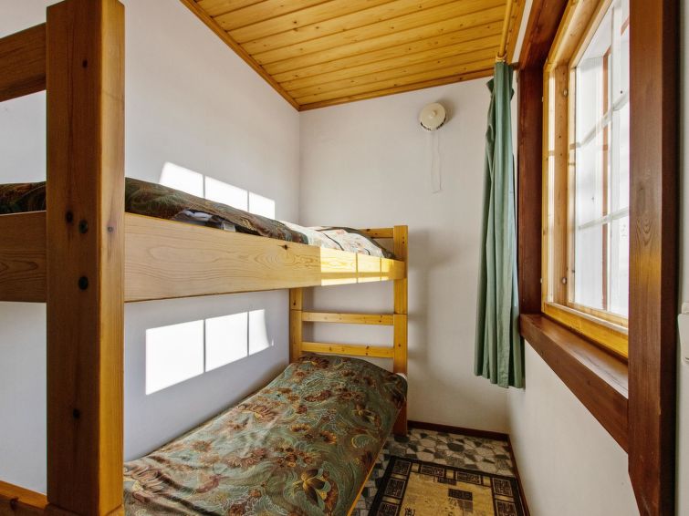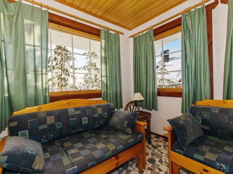The downstairs of a semi-detached house located in the Ukkohalla tourism centre, 4 + 2persons, 42m², built in 1990, kitchen, 2 sleeping corners, sauna, shower room/toilet, fireplace, bunk bed in the sleeping corner, 2 beds in the other sleeping corner, an opening sofa-bed in the living room. Not suitable for people with reduced mobility. The entrance is located down the stairs from the street level.