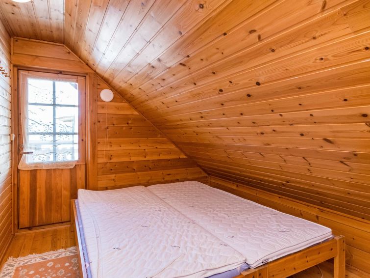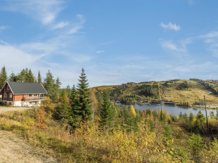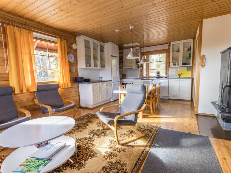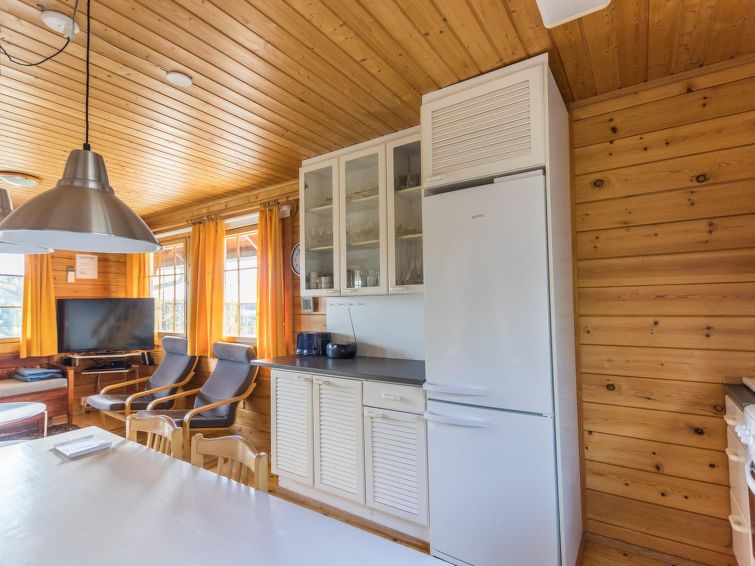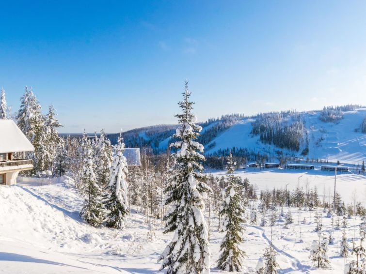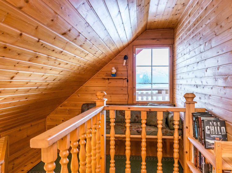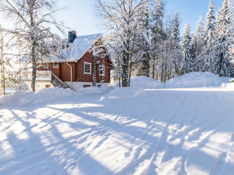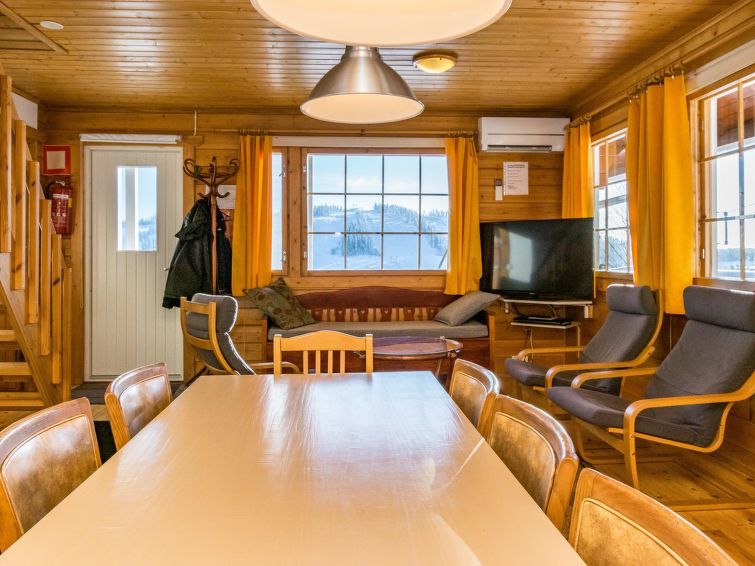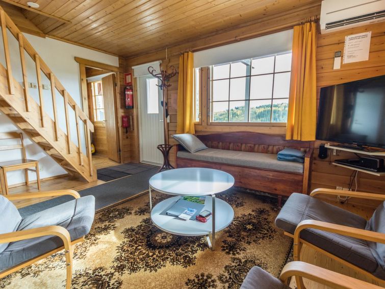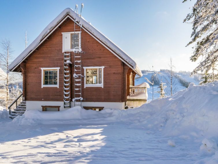 The upstairs of a semi-detached house located in the Ukkohalla tourism centre, 7 persons, 75 m², built in 1991, kitchen, 3 bedrooms, loft, sauna, shower room, separate toilet , balcony, storage, fireplace. 2 beds in the bedrooms upstairs, one bed on the loft, two 80cm beds in the bedroom downstairs. Price includes 1 bag of firewood. Extra wood from caretaker 10 eur/bag.