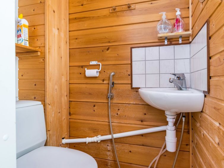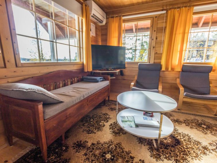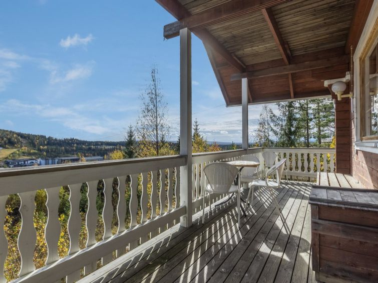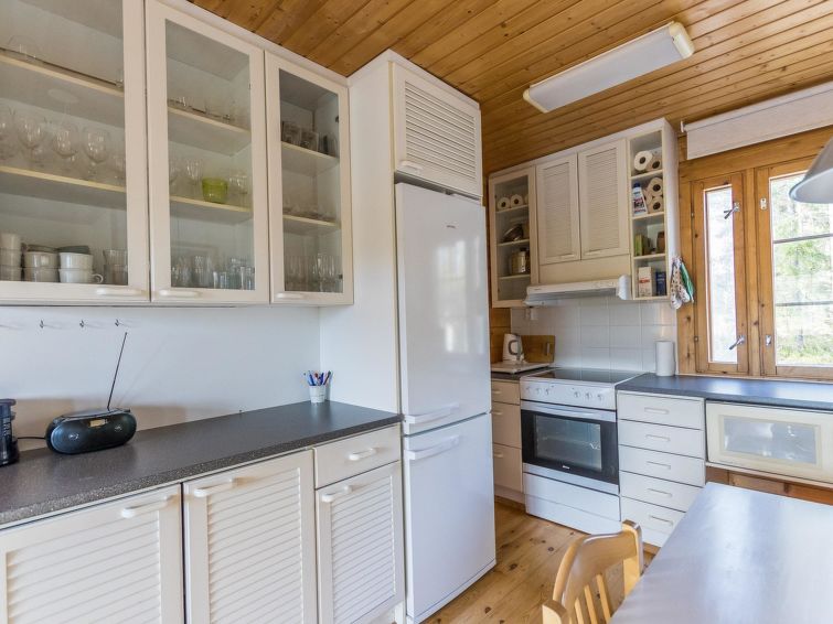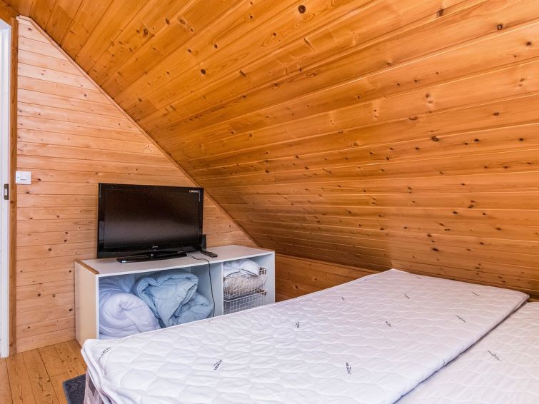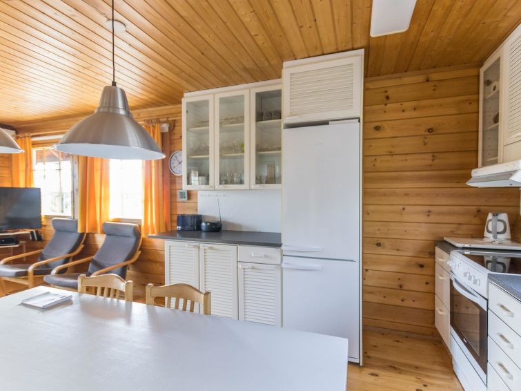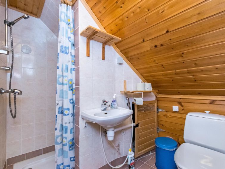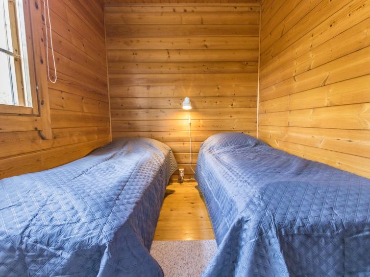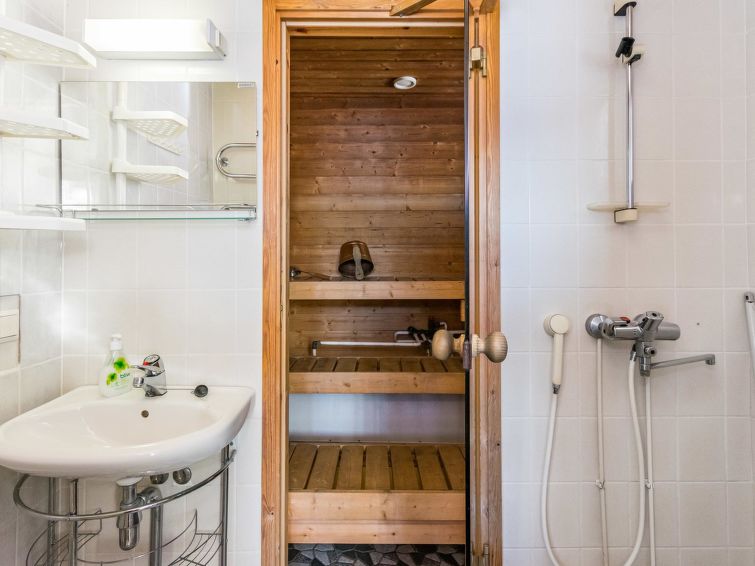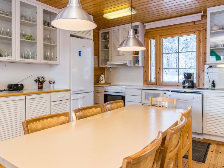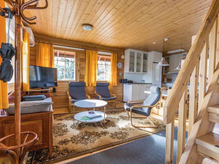The upstairs of a semi-detached house located in the Ukkohalla tourism centre, 7 persons, 75 m², built in 1991, kitchen, 3 bedrooms, loft, sauna, shower room, separate toilet , balcony, storage, fireplace. 2 beds in the bedrooms upstairs, one bed on the loft, two 80cm beds in the bedroom downstairs. Price includes 1 bag of firewood. Extra wood from caretaker 10 eur/bag.