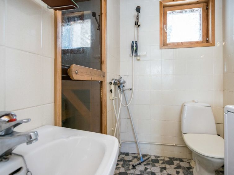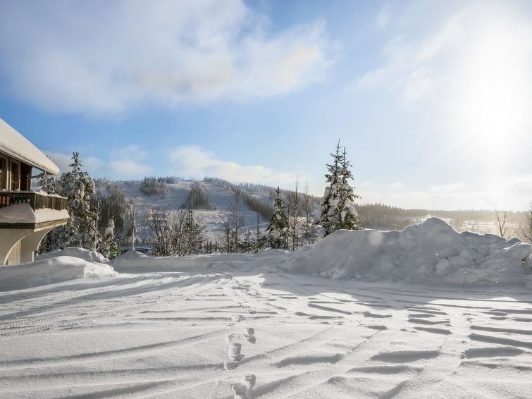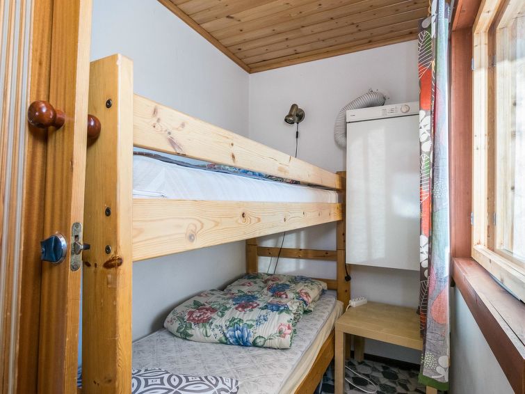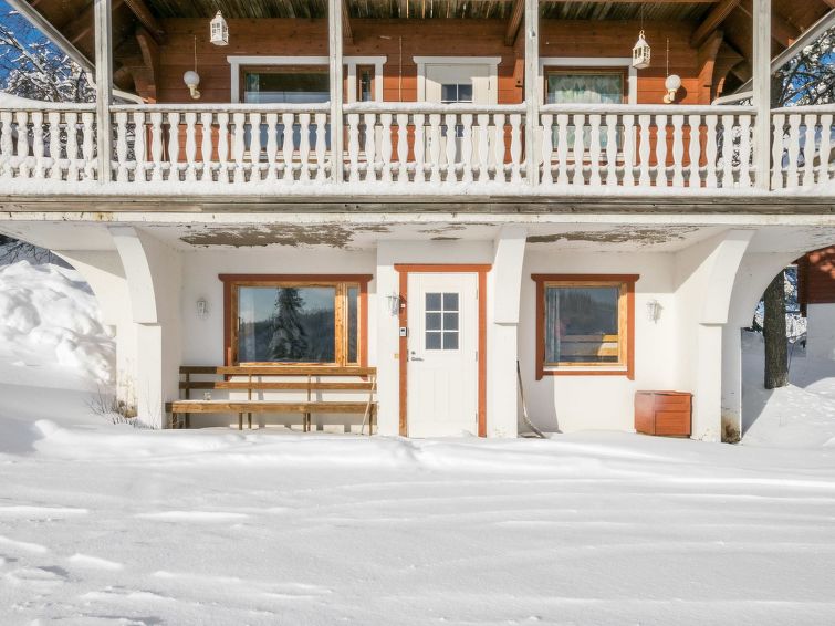 The downstairs of a semi-detached house located in the Ukkohalla tourism centre, 4 persons, 42 m², built in 1992, kitchen, bedroom with two beds, sleeping corner with a bunk bed, sauna, shower room/toilet, terrace, vestibule, fireplace, sofa-bed in the living room.