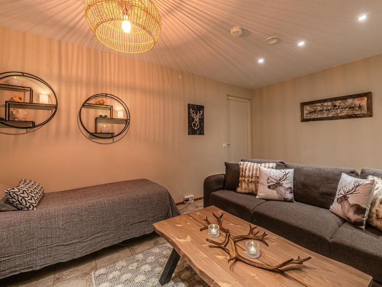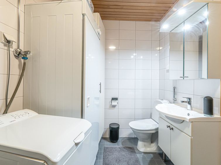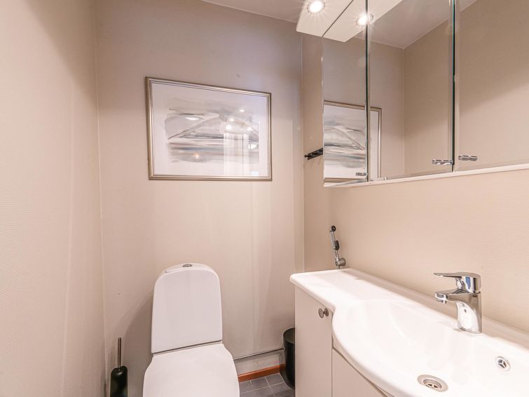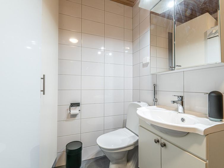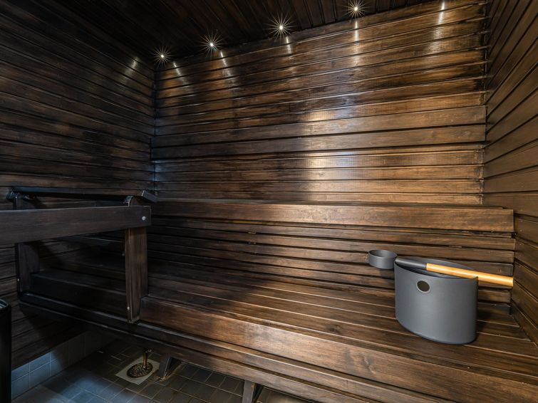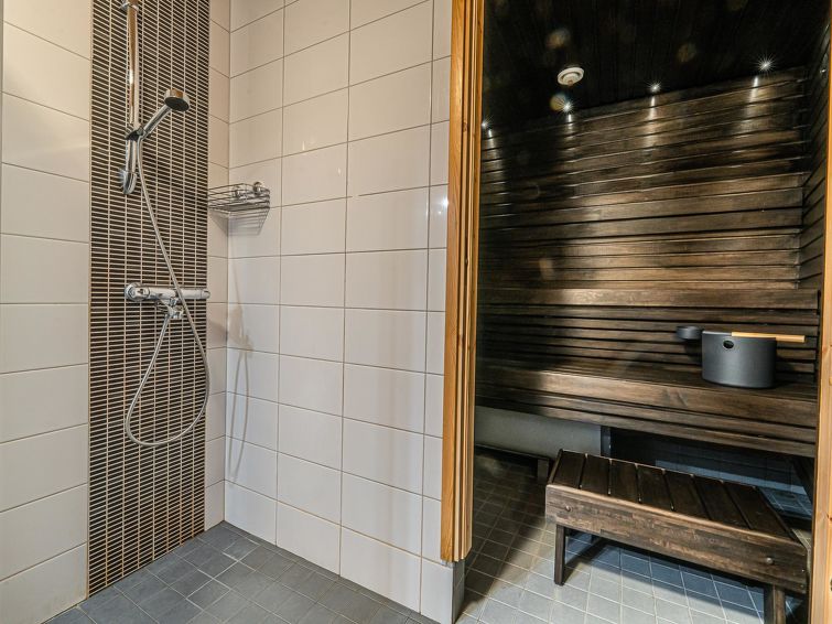 On the basement floor there is a spacious room with fireplace, 2 beds and sofa bed, sauna and washroom/WC. In the fireplace room, there is also a chair that can be used as an extra bed. The apartment can accommodate a maximum of 7 people.