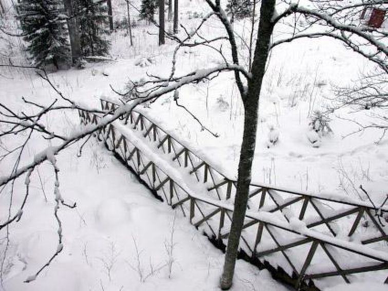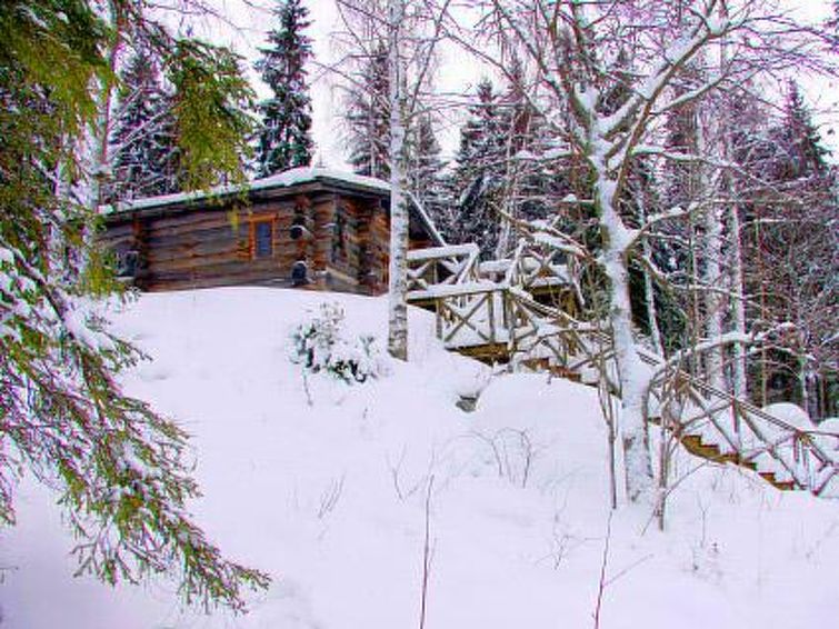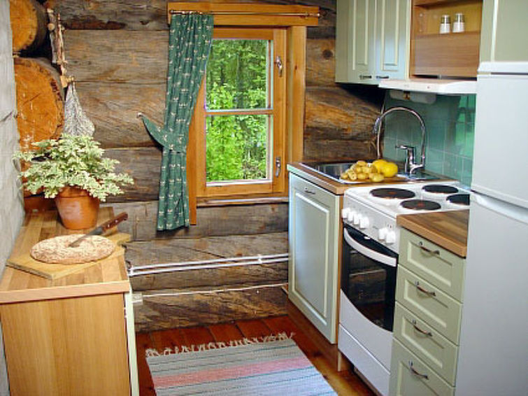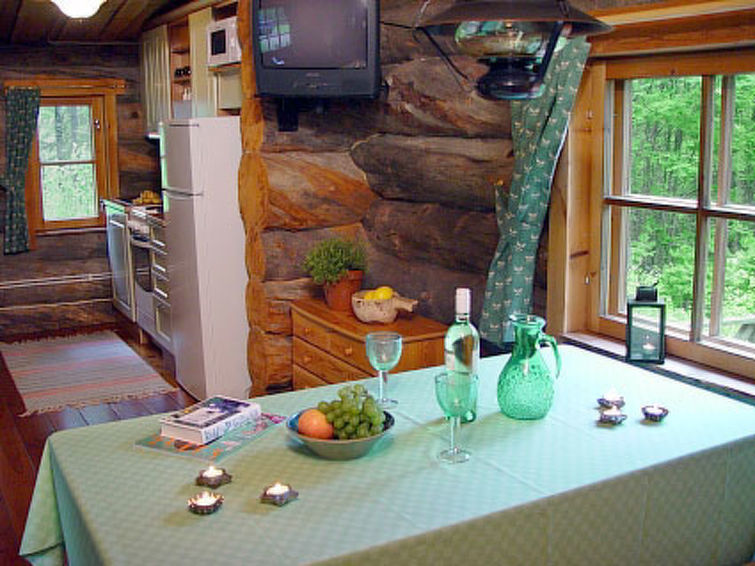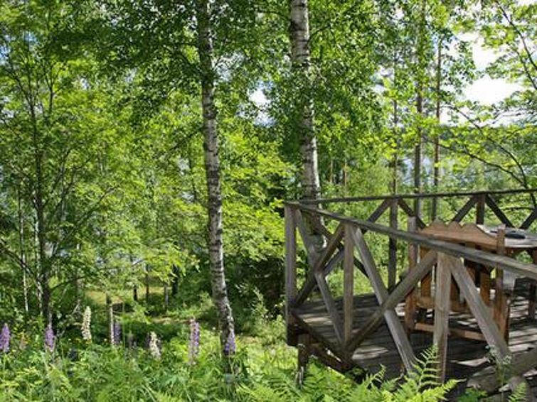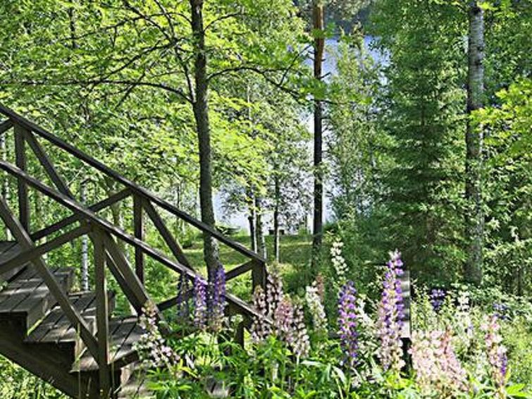 Log cabin 1986, living room/kitchen, sleeping alcove with double bed, dressing room, sauna, 2 x verandas, one to the lake (24 sqm) and the other to the yard. Portable charcoal BBQ grill. Coal must be brought. Acces to sauna and toilet through the veranda. Steps from the veranda on the lake side down to the beach. A steep slope from the cottage to the beach.