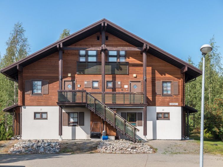 Two-storey chalet 2003, an apartement in the second floor, kitchen-living room, bedroom with two beds, washroom, sauna (electric stove), hall and a big terrace towards the ski slopes. Skistorage, two car plugs.