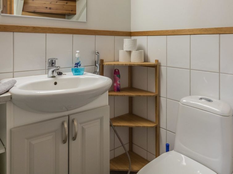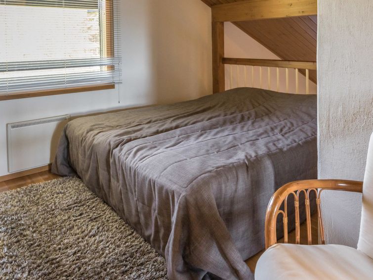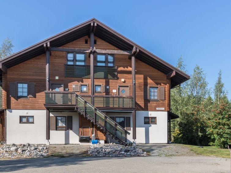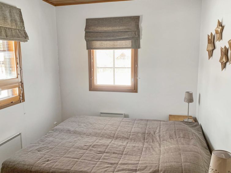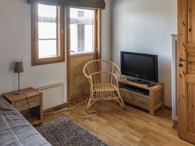 Two-storey chalet 2003, an apartement in the second floor, kitchen-living room, bedroom with two beds, washroom, sauna (electric stove), hall and a big terrace towards the ski slopes. Skistorage, two car plugs.