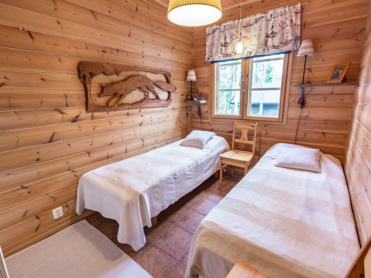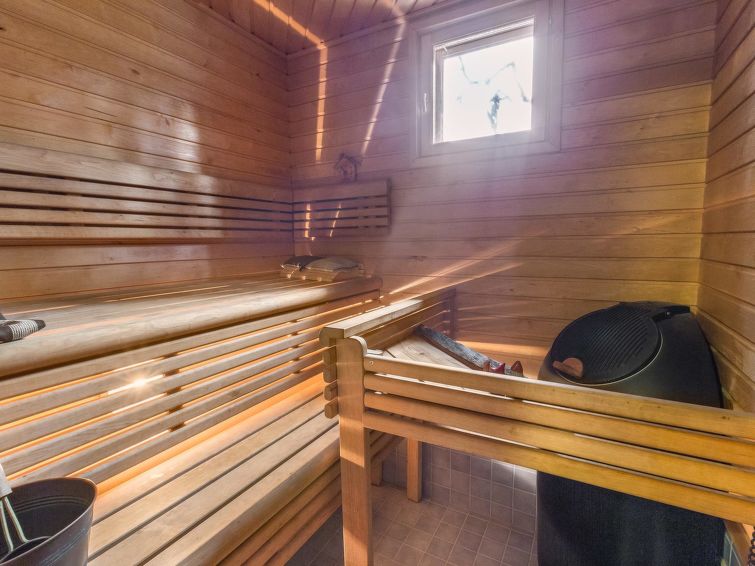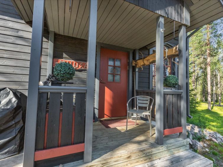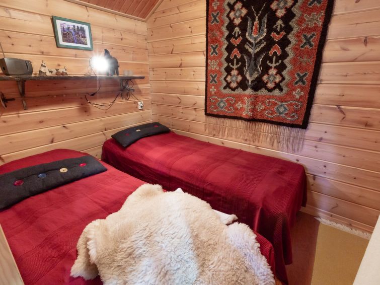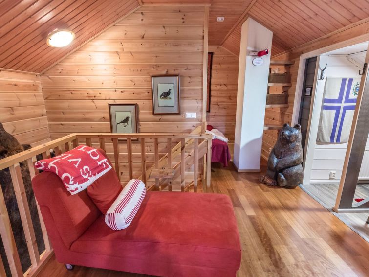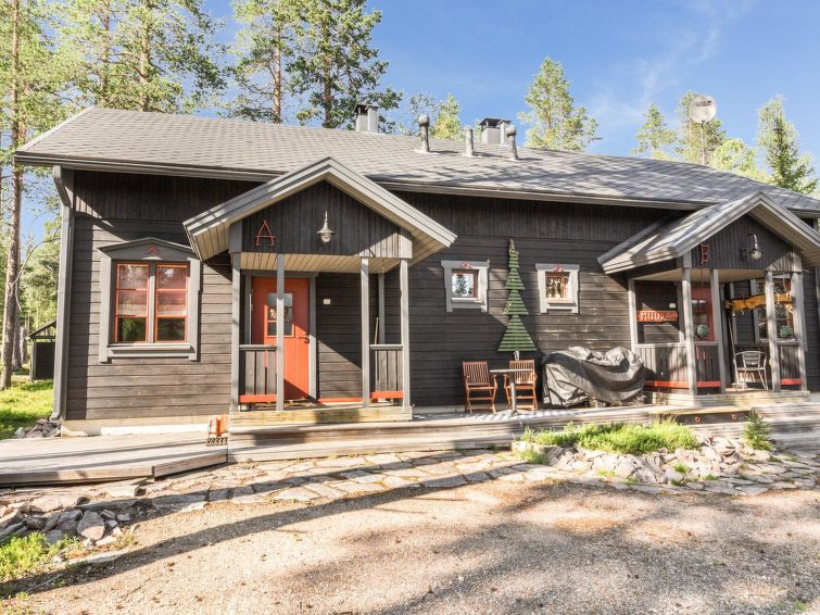 A log duplex apartment located 165 km north of Rovaniemi in Ylläsjärvi village. Built 2003. Livingroom/kitchen, downstairs bedroom with two beds, upstairs with 2 beds and additionally a sleeping alcove with two beds, electric sauna with "instant stove", washing room, toilet.Other apartment of this house is number 830615. Stock with ski waxing rack. Shared with Alppitalo A (830615) apartment.