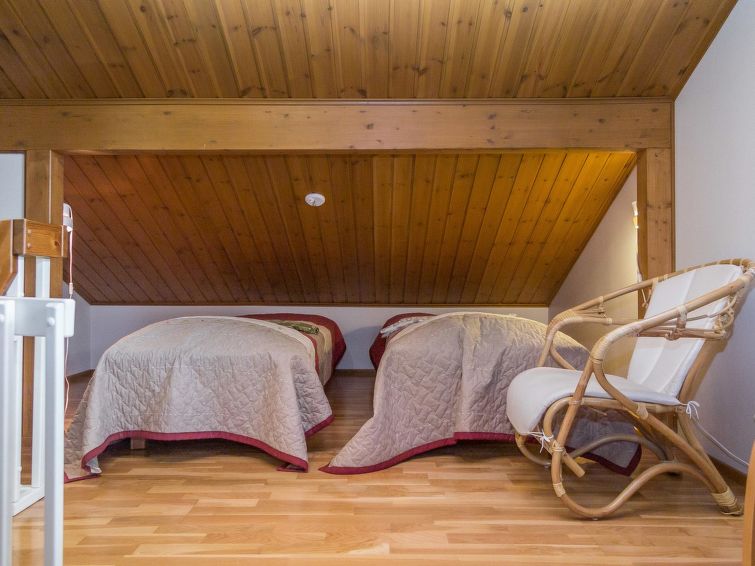 Two-storey chalet 2002, an apartement in the second floor, kitchen-living room, bedroom with 2 beds, upstairs a loft, in which 4 beds, washroom, sauna (electric stove), hall and a big terrace.