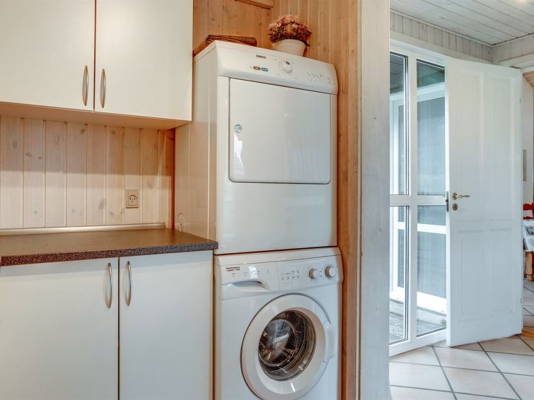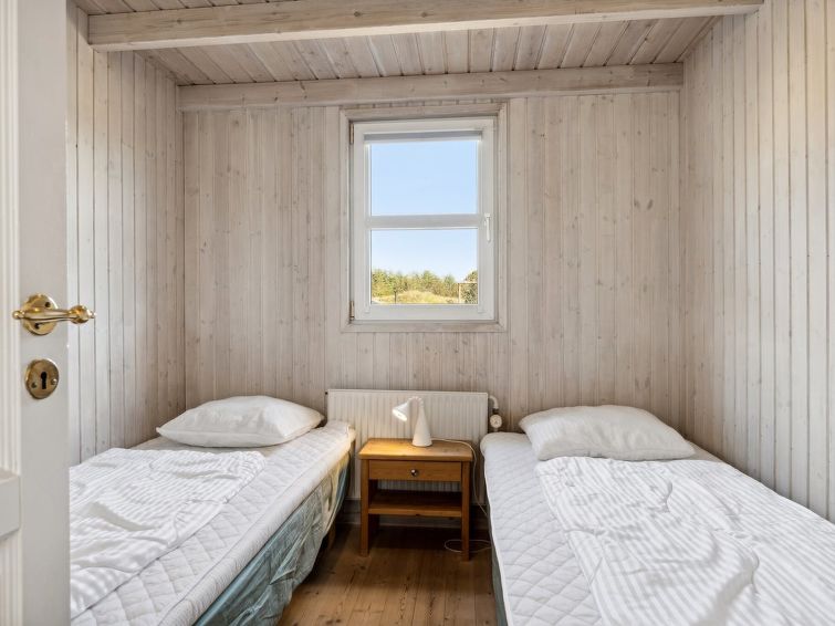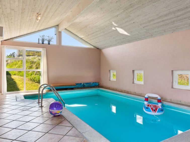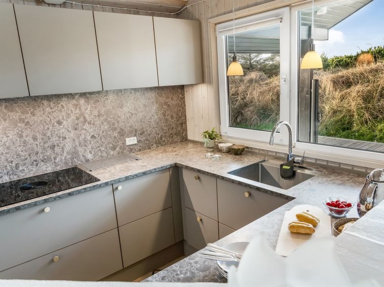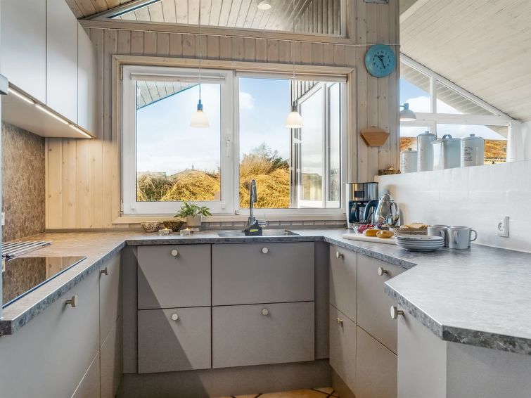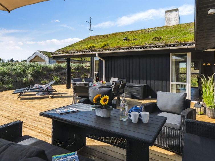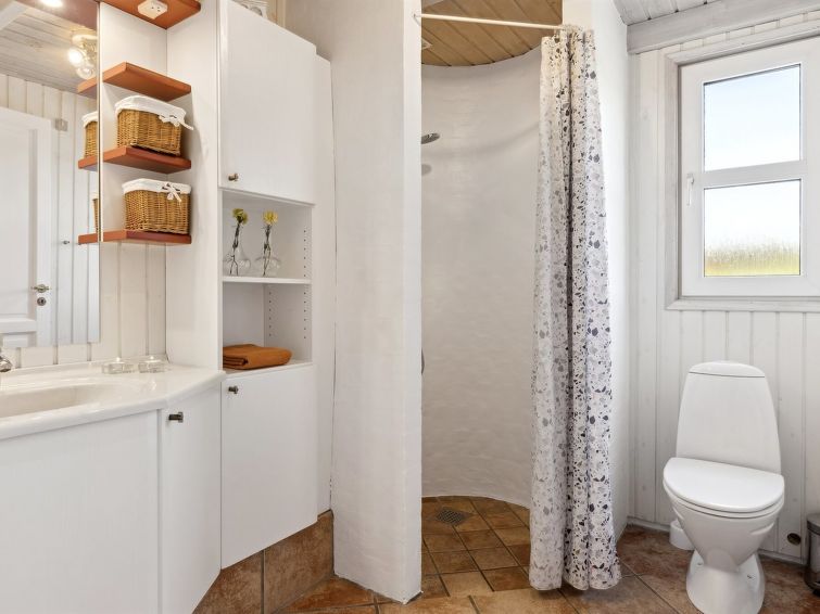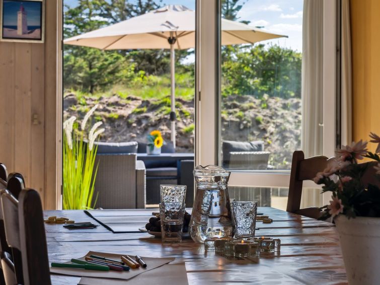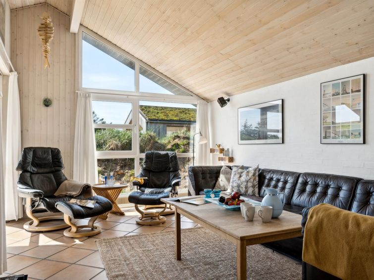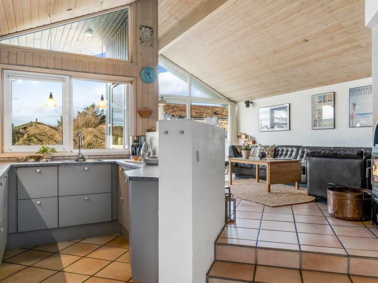"Alrune" - 800m from the sea in NW Jutland", 4 rom hus 159 m2. Passer for 8 voksne. Stue med, TV, radio, CD-spiller, stereoanlegg og DVD. 1 rom med, 1 dobbeltseng. 1 rom med 2 senger. 1 rom med, 1 dobbeltseng. 1 rom med, 1 dobbeltseng. Kjøkken (stekeovn, oppvaskmaskin, 4 keramiske kokeplater, mikrobølgeovn, frys). 2 dusjer/WC, boblebad. øverste etasje: åpen galleri. Terrasse 8 m2, dekt. Fasiliteter: høy barnestol. Internett (trådløs LAN [WLAN]). Vennligst merk: røykfri bolig. Max kjæledyr / hund tillatt 1 kjæledyr / hund tillatt.