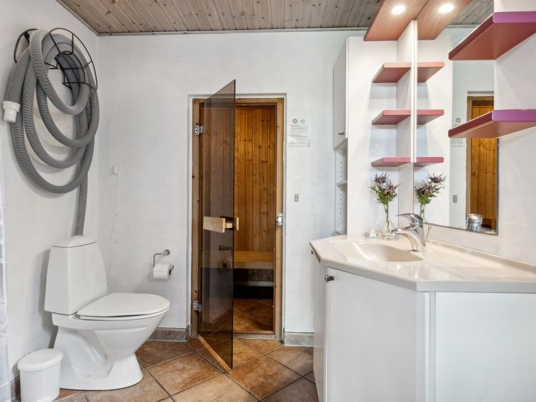 Enmannsbolig, bygget i 1997. 800 m fra sjøen. Privat: uberørt tomt 1'614 m2, innendørs pool (3 x 5 m, 1'7.5 m2, dybde 125- 125 cm dyp). Terrasse (60 m2), lekeplass (huske). I huset: badstu, vaskemaskin, tørketrommel. Parkering ved hbrukt. Daglivarehandel 2 km. Eieren godtar ikke noen ungdomsgrupper.
